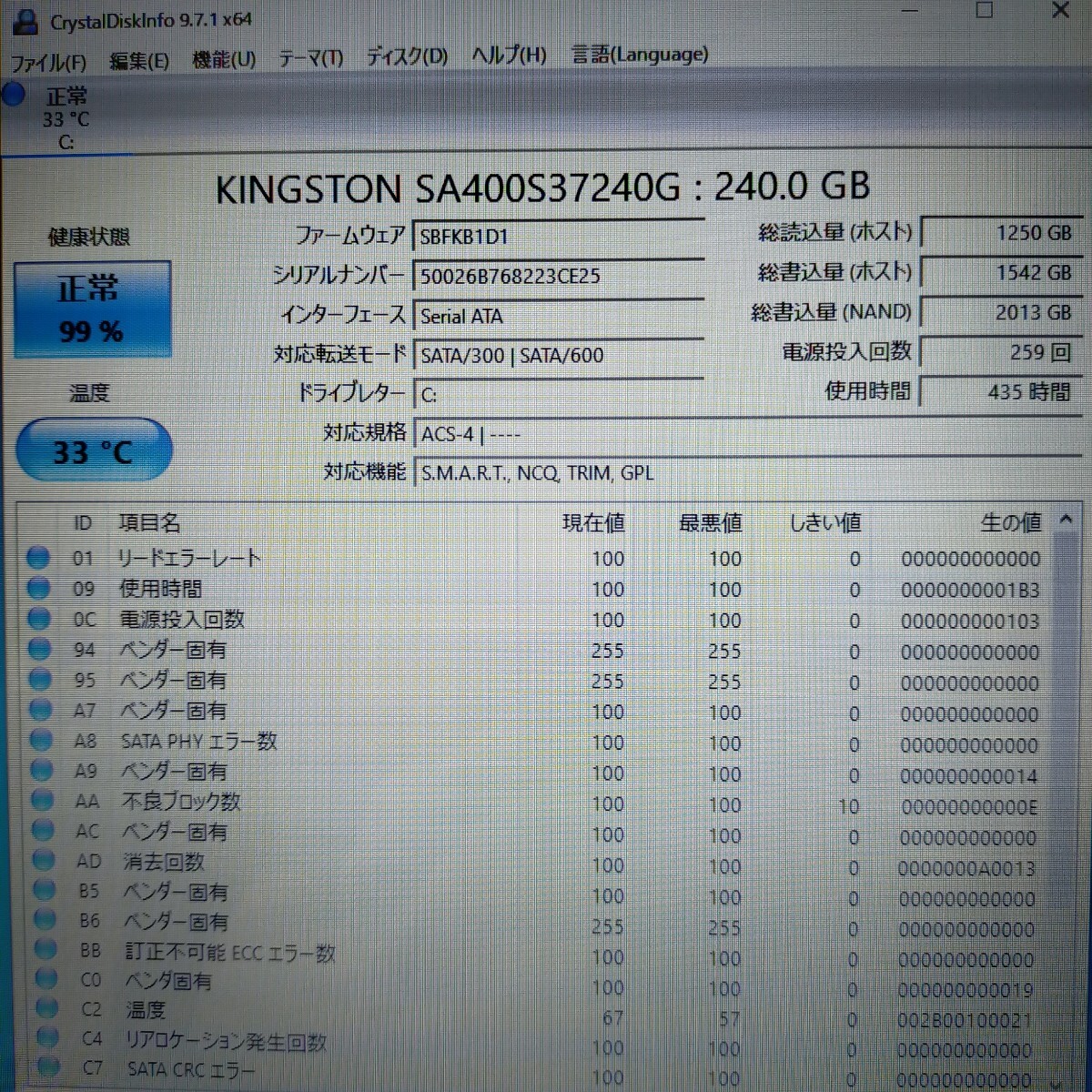 ・SSDは使用時間が440時間ほどと短く、動作も良好です。