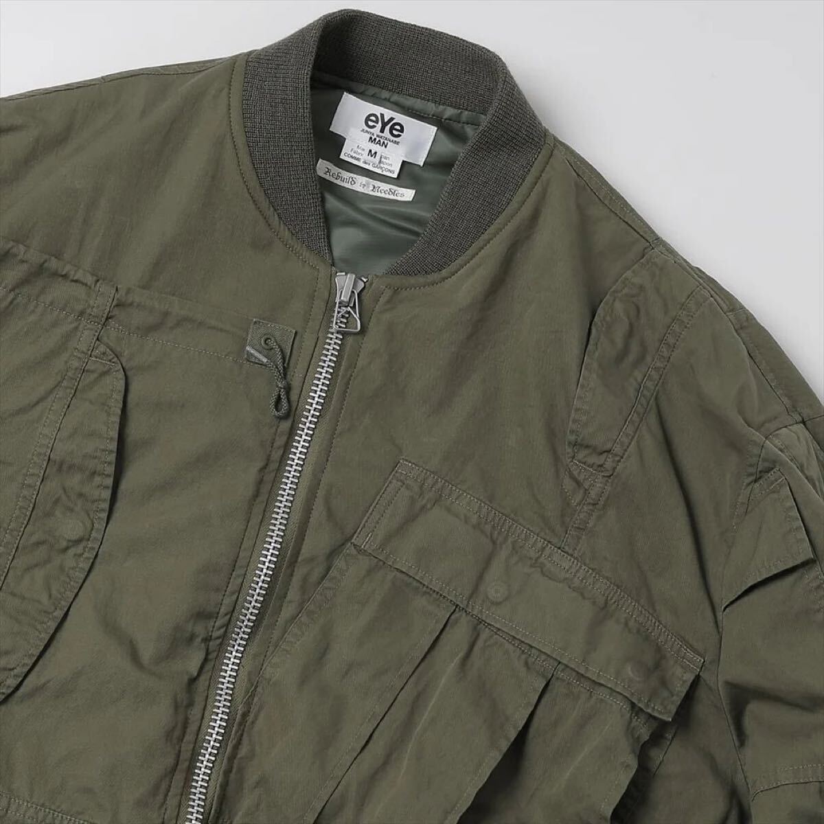 セレクトショップ「ネペンテス」によるオリジナルブランド「NEEDLES(ニードルズ)」との初コラボレーションとなるジャケットはその中でもスペシャルなプロジェクトとして展開していた《REBUILD by NEEDLES(リビルド バイ ニードルズ)》によるアイテムを再現した一枚。「過去に大量に作られた物の今の時代に街で着る洋服としては存在しにくい物」古着の中からその様なカテゴライズされたものをピックアップし手の込んだテクニックで再構築させるシリーズです。eYe JUNYA WATANABE MANにおいてはこのプロジェクトで作られた過去のアーカイブよりアイテムをピックアップ。それを当時と同じ様に再現しています。アメリカ軍のM-51と呼ばれる6ポケットのカーゴパンツを複数解体、それらのパーツを使用しMA-1タイプのジャケットに再構築させるというオリジナルのデザインをもとに、ジュンヤマンにおいてはベースとなる新たなカーゴパンツのパーツを作成、それにユーズド加工を加えて本物の古着の様なテイストを作って同様のデザインを再現するという、こちらも非常に手の込んだ作りとなっています。