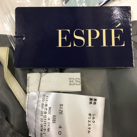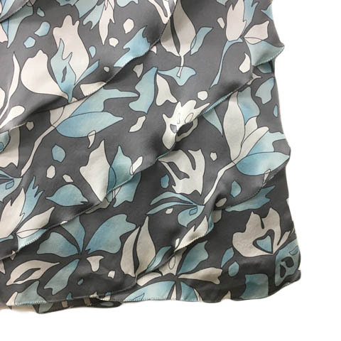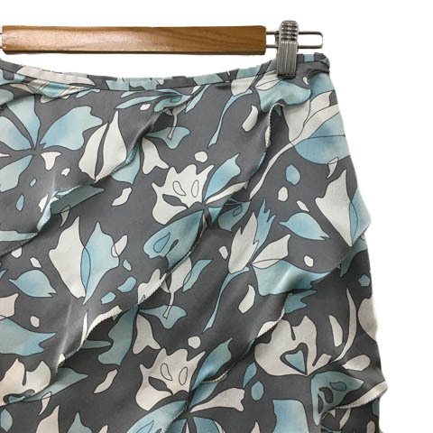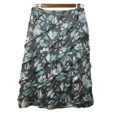 未使用品 エスピエ ESPIE スカート フレア 膝丈 ティアード 総柄 シルク 40 グレー 水色 ライトブルー レディース