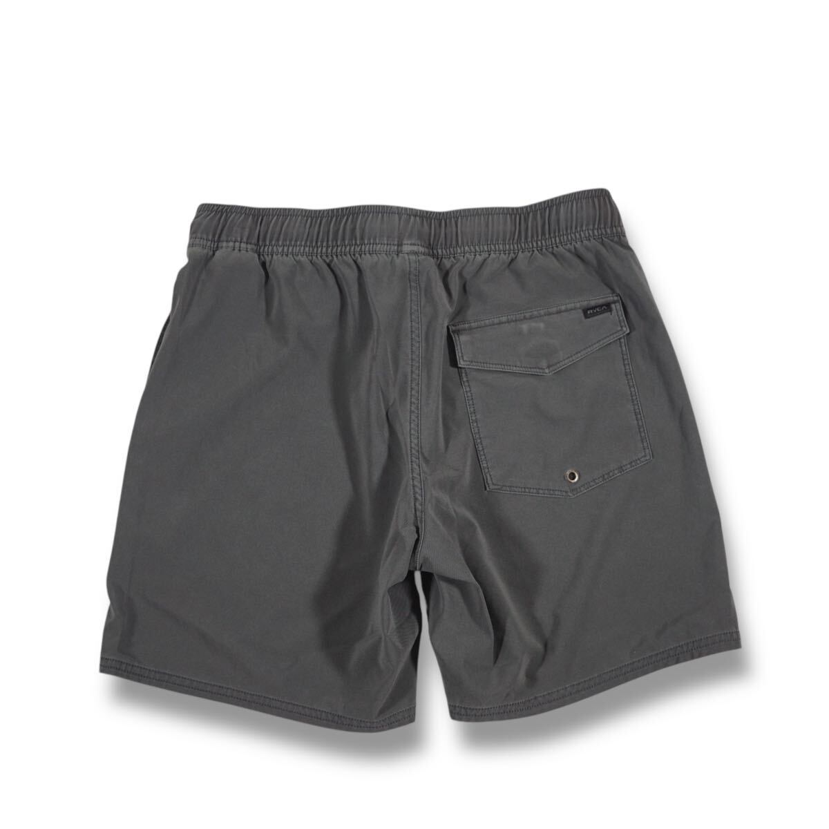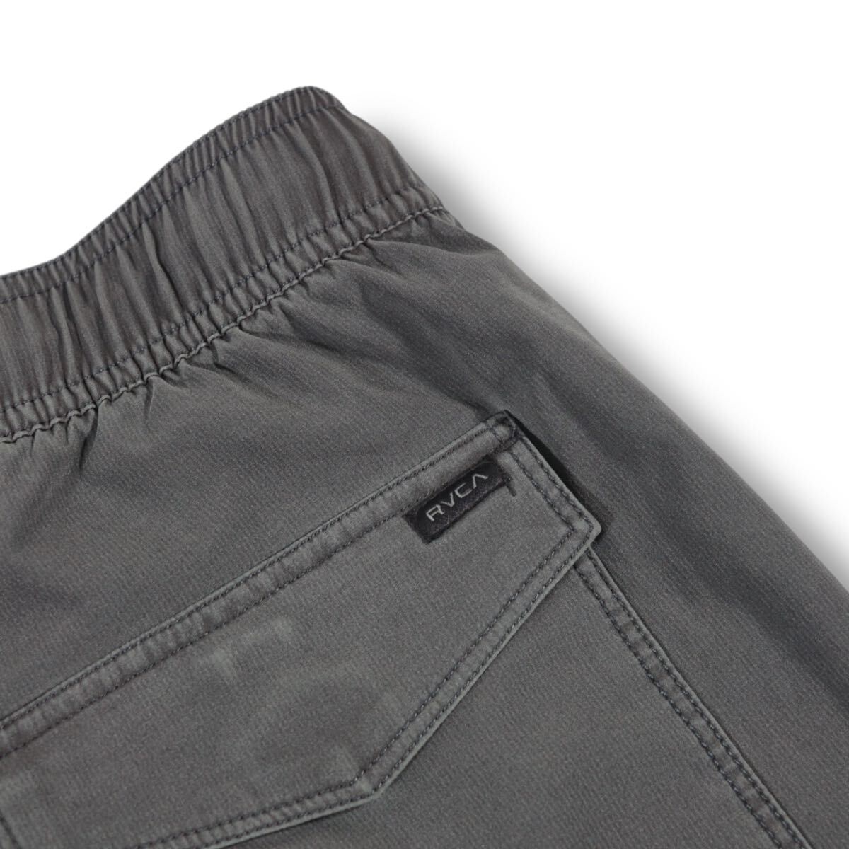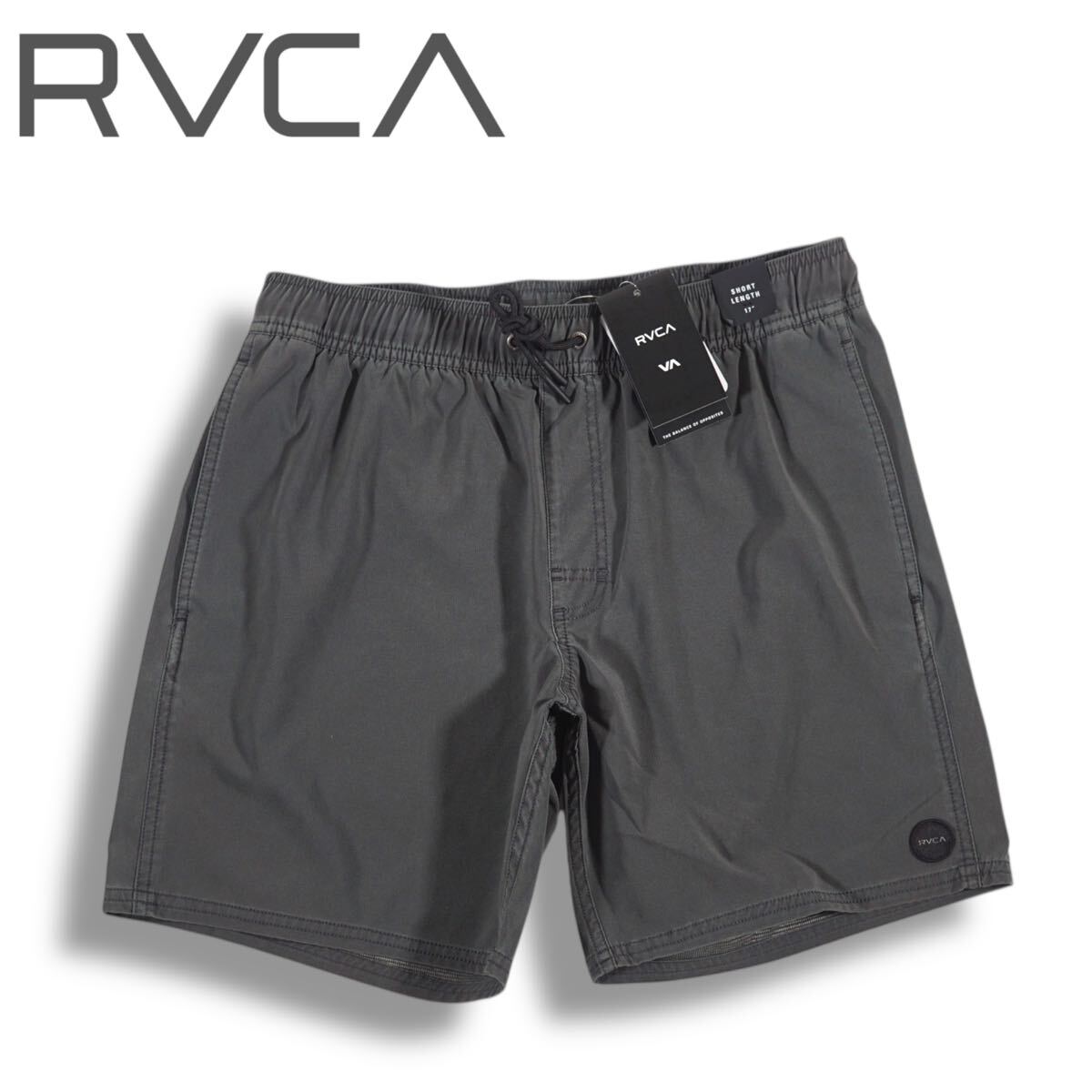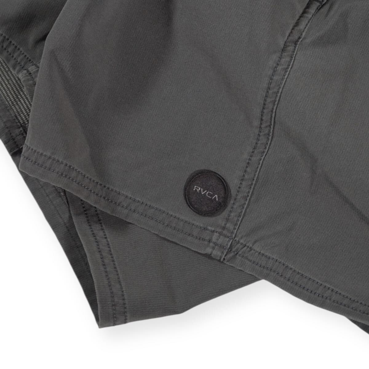 左裾にRVCAのサークルパッチを施したボードショーツ。縦横に伸縮する4WAYストレッチで、ゴムウエストにはドローコードを内蔵