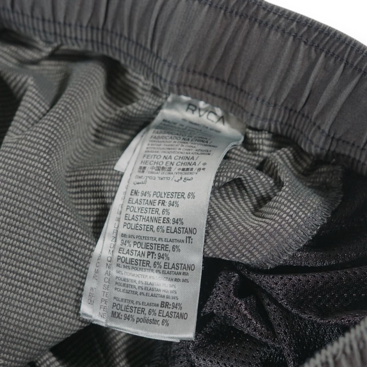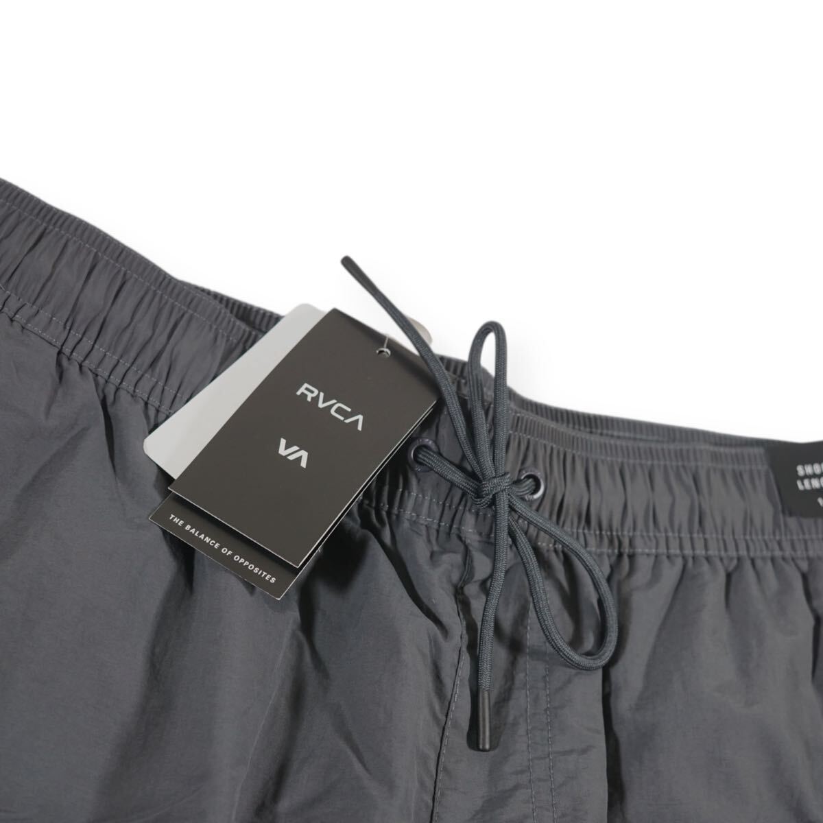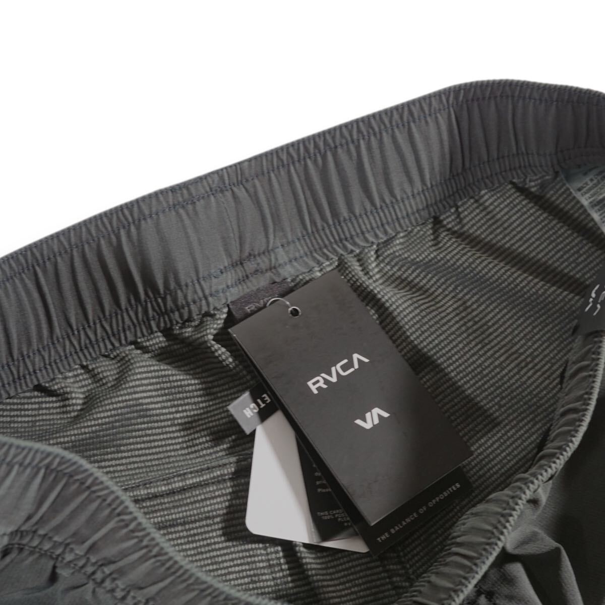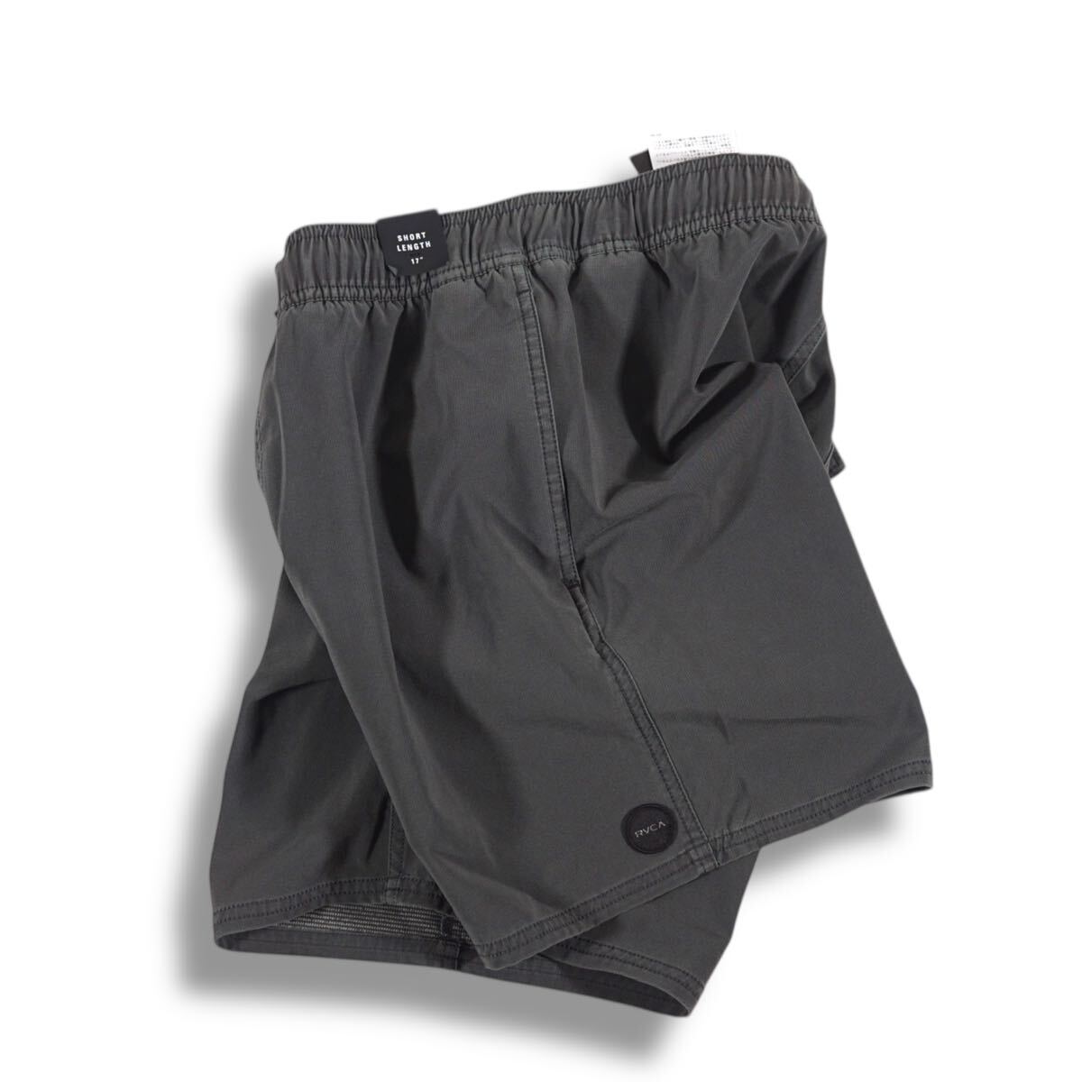 左裾にRVCAのサークルパッチを施したボードショーツ。縦横に伸縮する4WAYストレッチで、ゴムウエストにはドローコードを内蔵