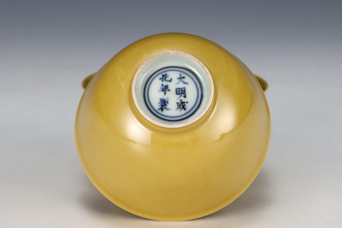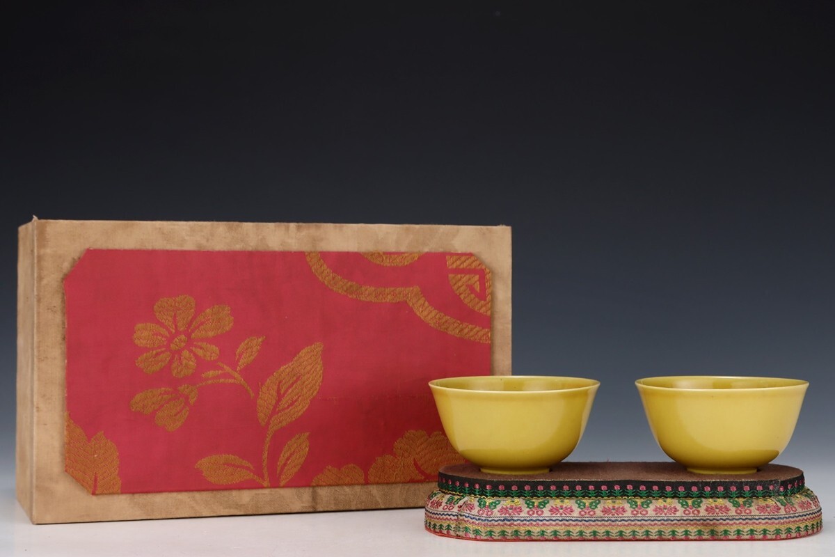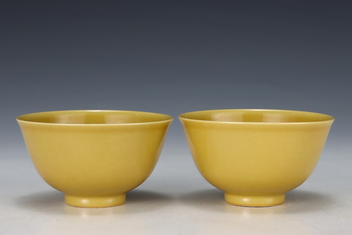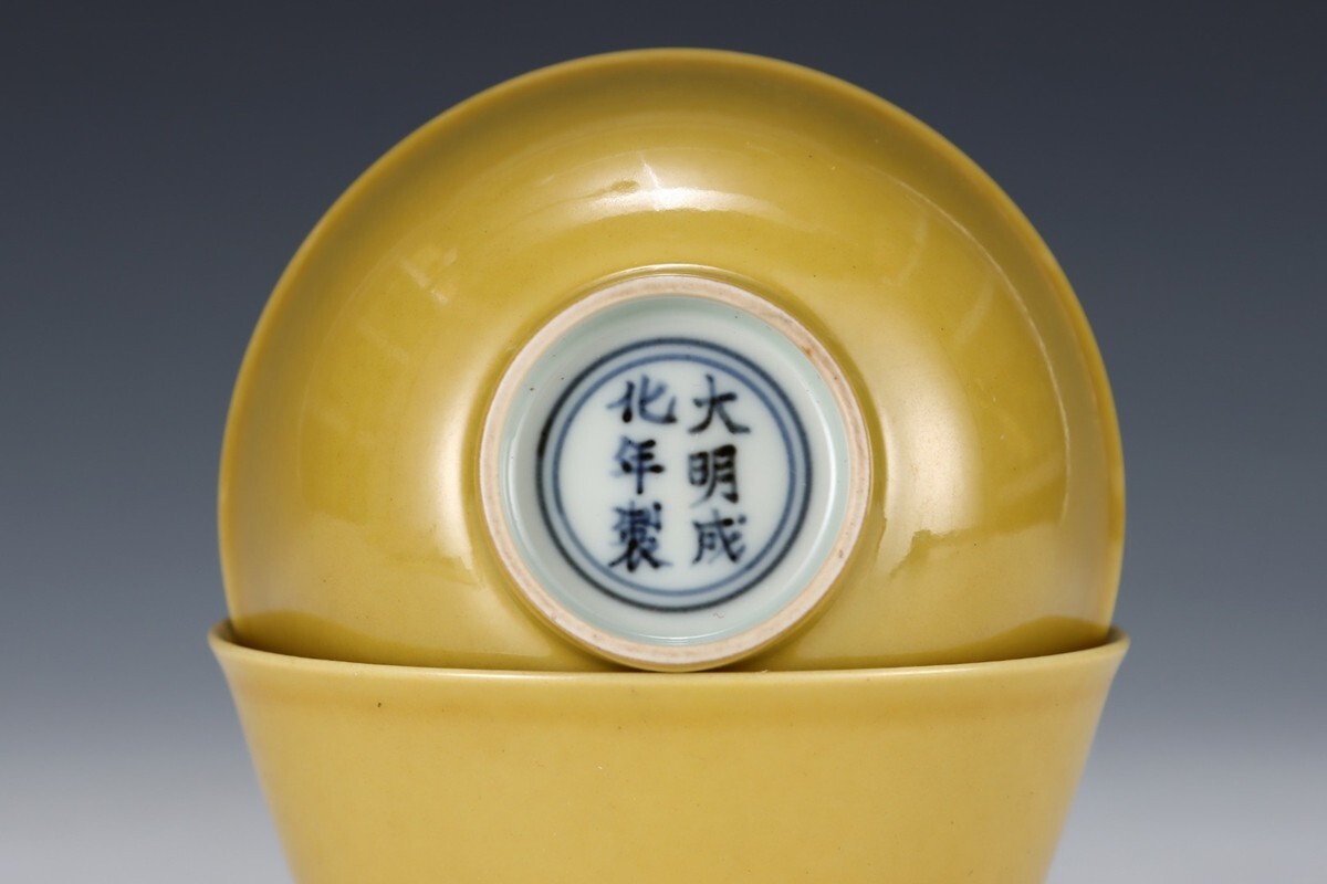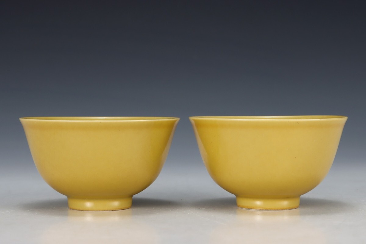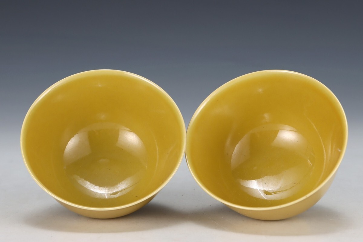 【瓏】陶磁器 黄釉 敞口杯一対 大明成化年製 染付 置物擺件 古賞物 古美術 陶芸 蔵出