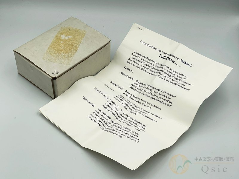 商品説明 | フルトーンの人気歪みシリーズであるFULL-DRIVEの最初期モデルが入荷です! VOLUME、TONE、OverDriveにエフェクトのON/OFFとブーストのON/OFFと、多機能な現行モデルとは違い、非常にシンプルな構成が特徴的。 やや中低音域にシフトしたトーンはTS系のニュアンスも感じますが、かといって高音域がこもりすぎることもなく、バランスの良さが魅力です。 ブーストはゲイン25%アップと固定になっており、微調整ができませんが、ブーストをONにすると高音域がグッと持ち上がり、ソロやリフに最適な質感になります。 TS系は好きだけど何かが足りない…と悩まれている方には一度お試しいただきたい1台です。 ぜひこの機会にお求めください! 【状態】 全体のくすみ、細かな擦れ傷や線傷など、使用感や経年による劣化がございます。 その他裏面のステッカーが剥がれております。 動作は問題ございませんので、外観を気にされない方には大変お買い得なお品となっております。 並行輸入品 |