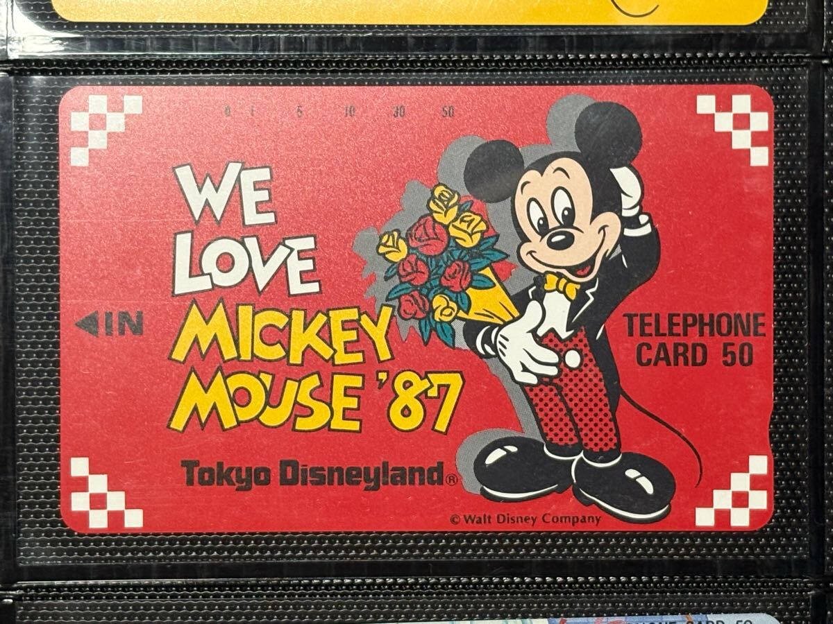 1987年に開催された「WE LOVE MICKEY MOUSE」キャンペーンを記念して発行された、東京ディズニーランドのテレホンカードです。タキシード姿のミッキーマウスが花束を持って微笑む、シンプルながらも温かみのあるデザイン。赤を基調としたポップな配色で、ヴィンテージ感あふれるレアな一枚としてコレクターに人気です。