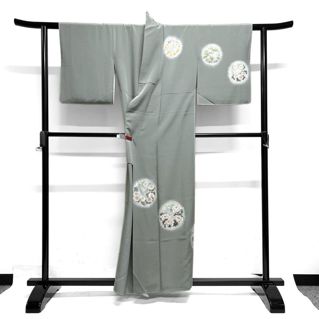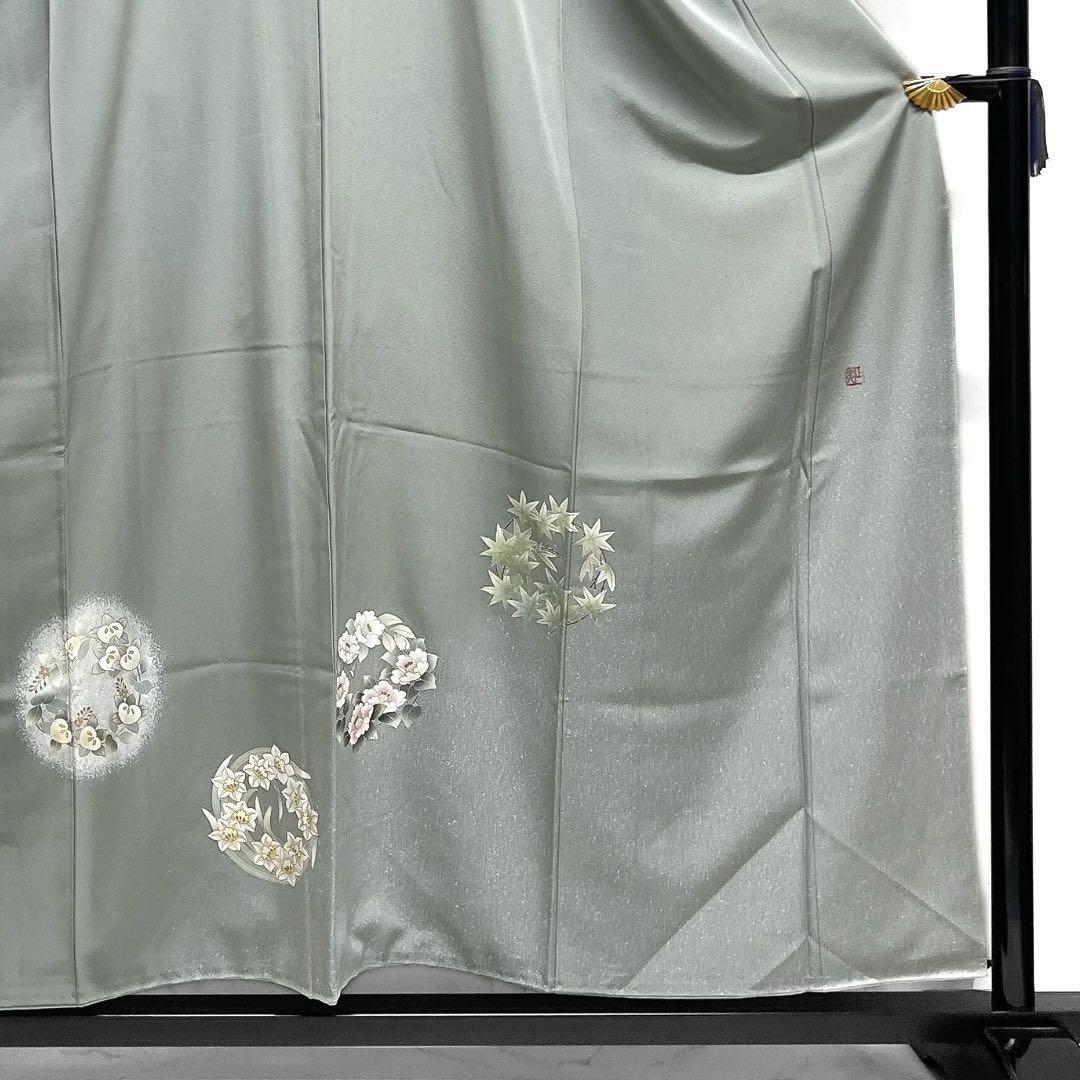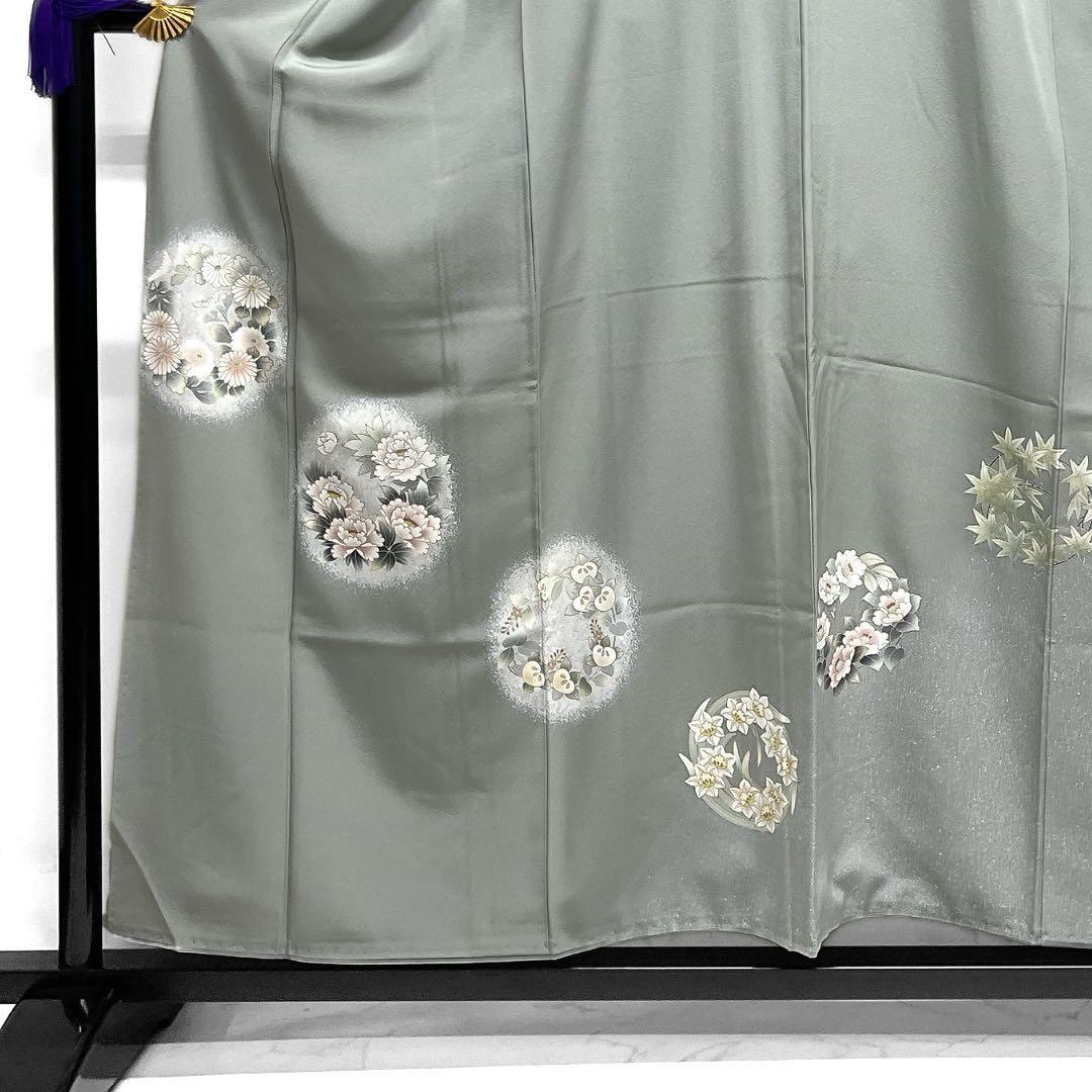 くすんだ薄いグリーンの地に金彩を交えて描かれた様々な花模様の花紋が華やかなデザインの一着です。
