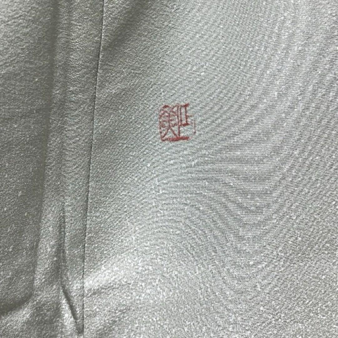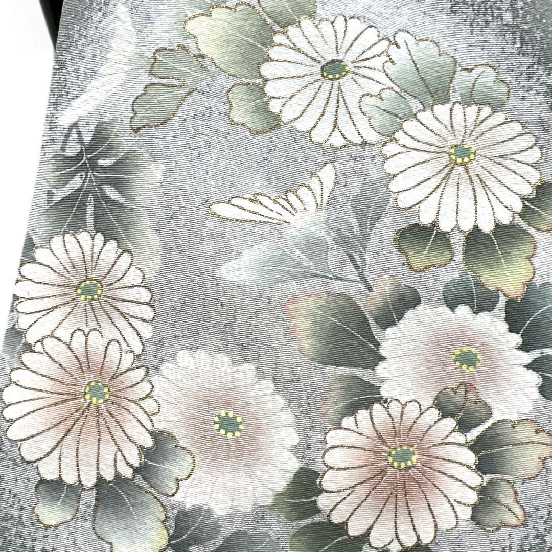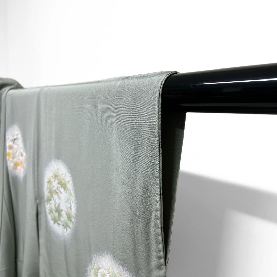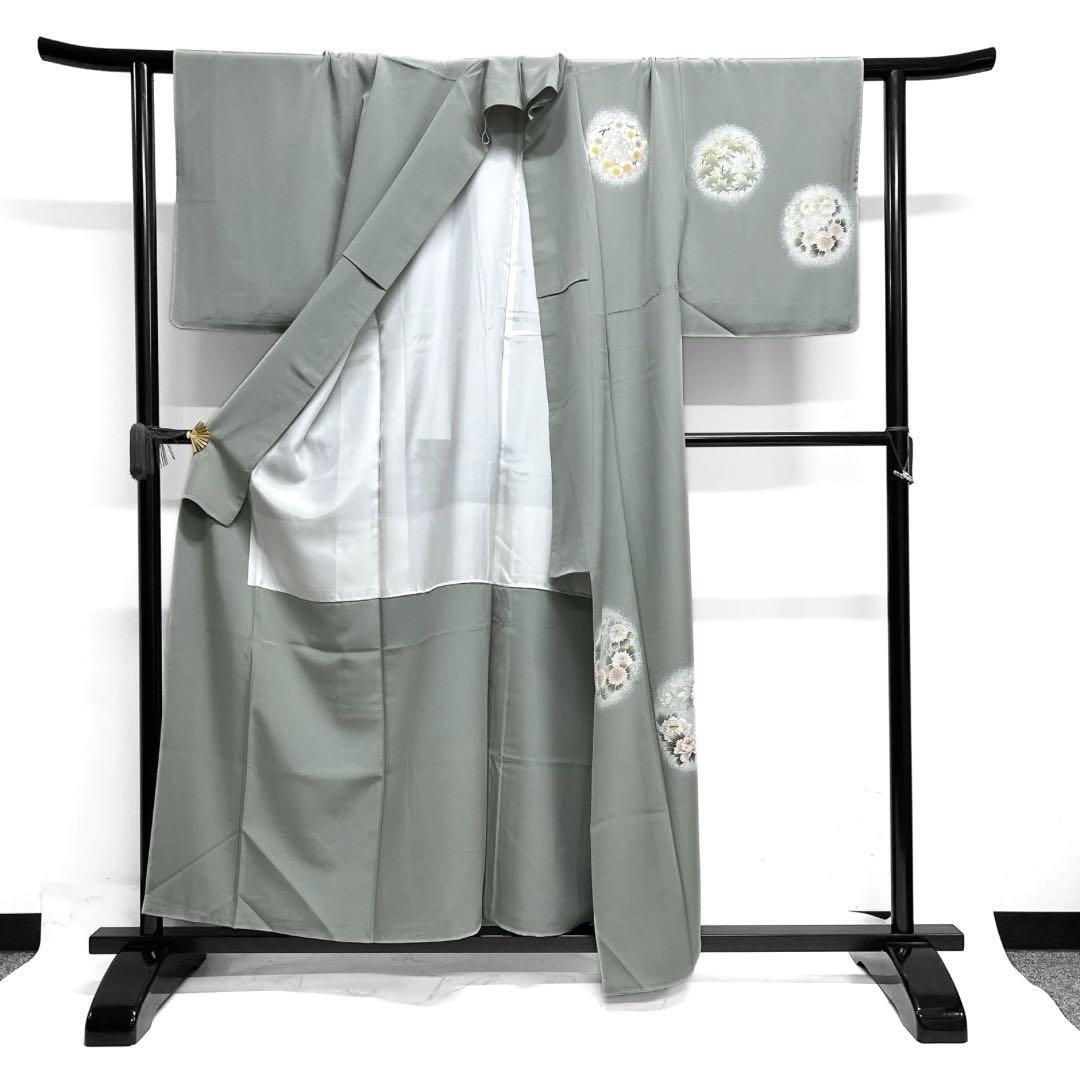 くすんだ薄いグリーンの地に金彩を交えて描かれた様々な花模様の花紋が華やかなデザインの一着です。