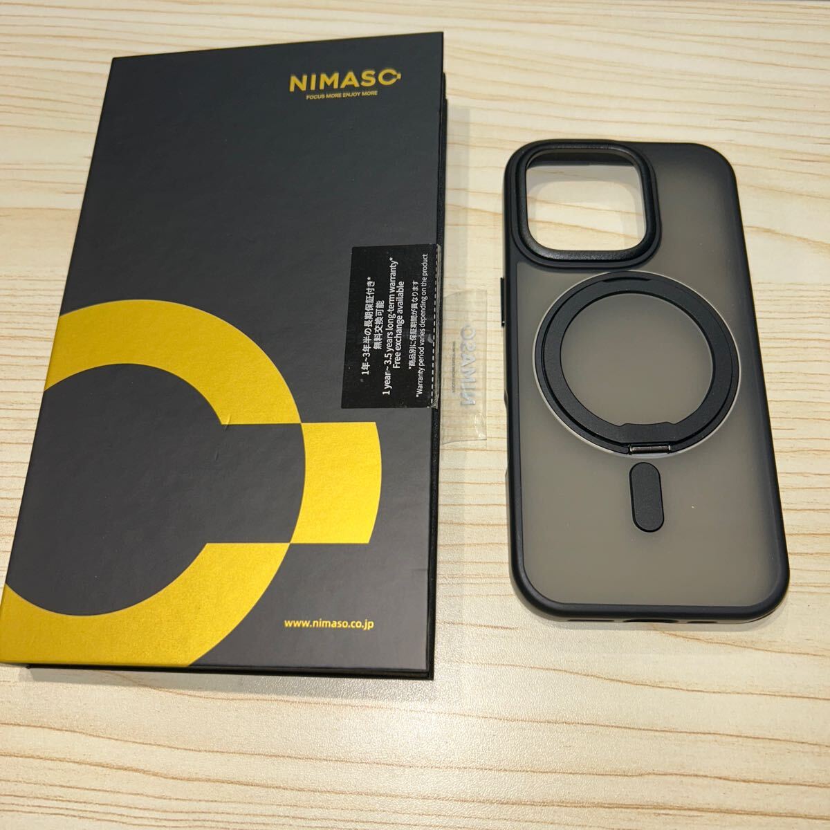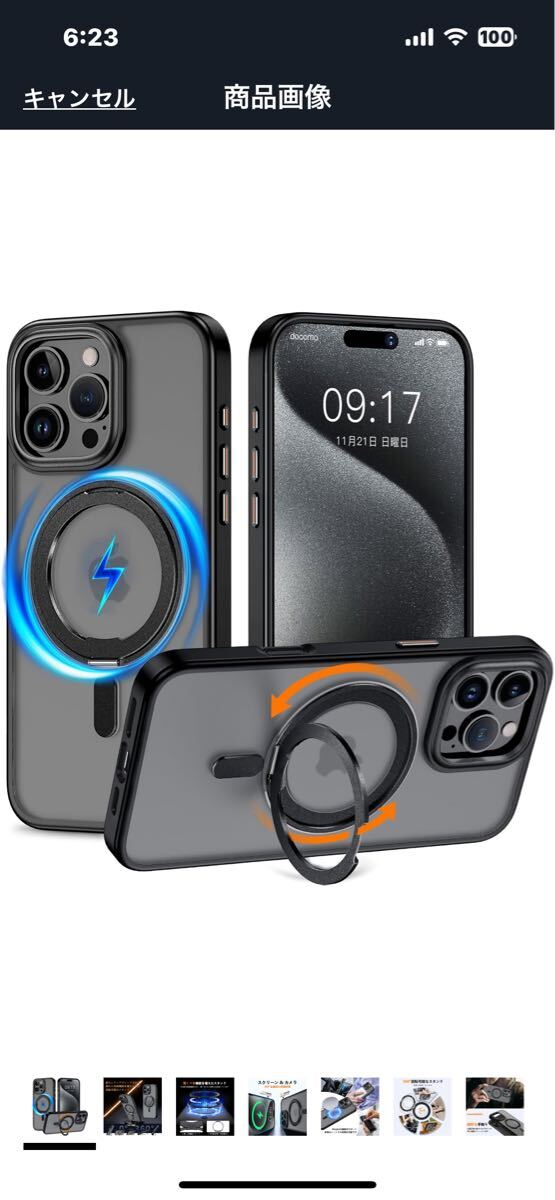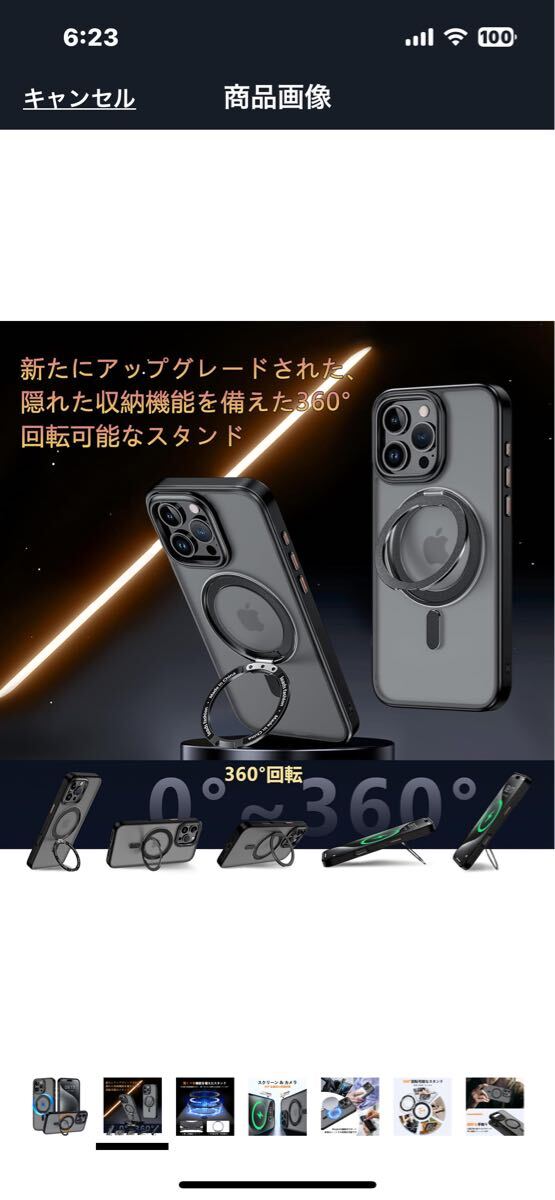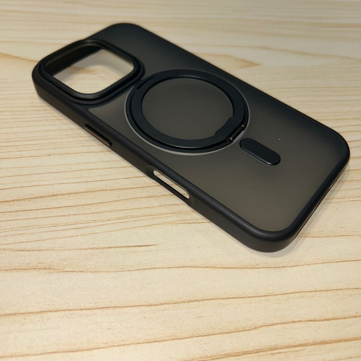 j151 iPhone 16 Pro 用 ケース 縦横両対応リング 【多機能360度回転スタンド】MagSafe 半透明マット スマホケース 米軍規格(ブラック)
