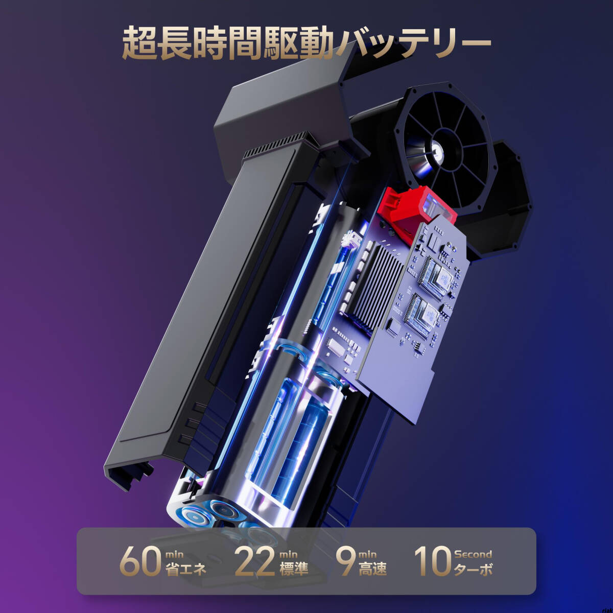 ・連続使用時間:1速約80分、2速約30分、3速約12分、ターボ約6分