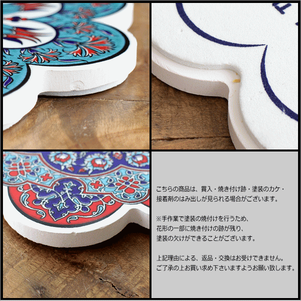 こちらのページでは【タイプN】のみの販売です 昔ながらの絵付けがエキゾチックな トルコの陶器プレートです モスクの壁を飾った華やかなタイルは その後、プレートに加工され 鍋敷きや、インテリアとして人気の 陶器のプレートです [商品名]トルコの陶器プレート (ras4867) 全体サイズ(cm):幅18.5×奥行18.5×厚さ1 重量:約300g 材質:陶器 原産国:トルコ ※傷防止のクッション材付き ※焼物特有の貫入が見られますが、ひび割れではありませんのでご了承ください ※小さな欠けや擦り傷はご容赦ください ※模様やサイズに個体差があります ※ディスプレイによる色の違いはご了承下さい |
