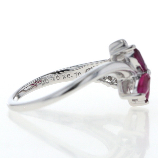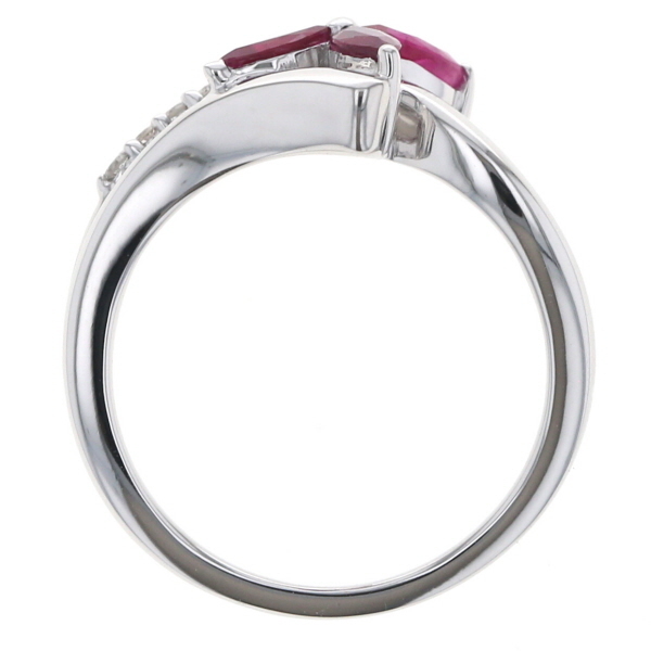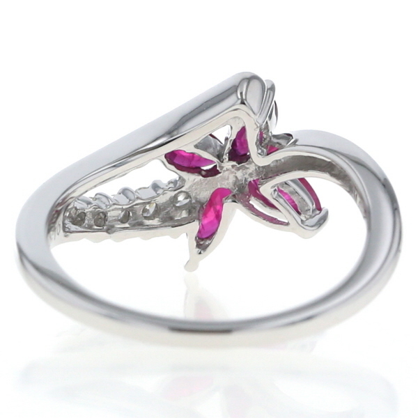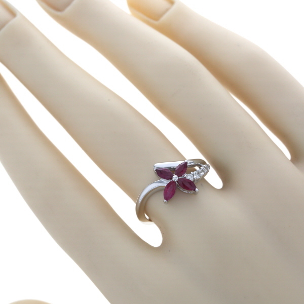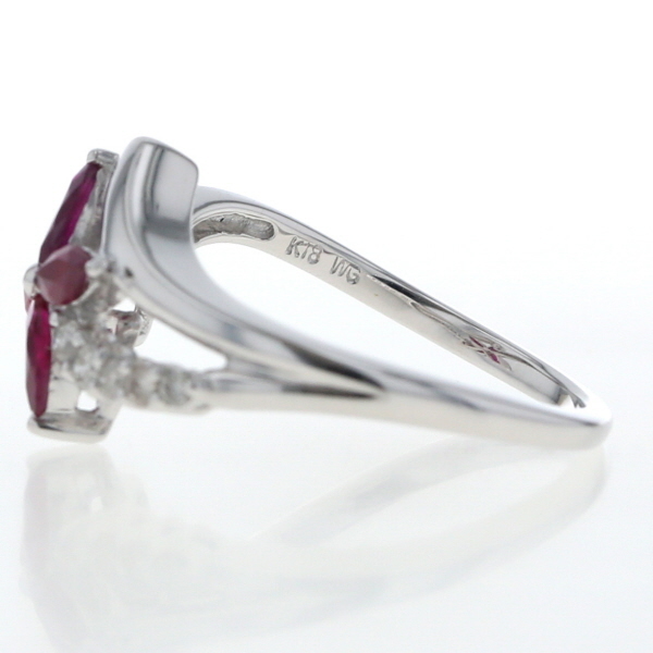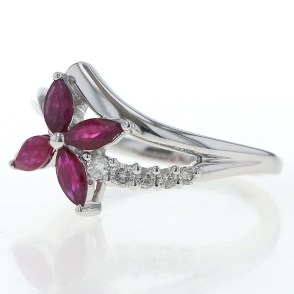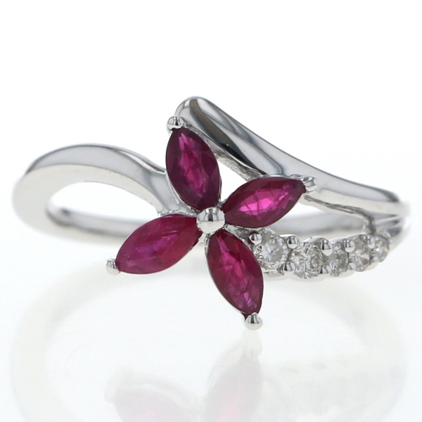 | 商品紹介 | 魅力的なフラワーデザインのルビーと、脇石のダイヤモンドが美しいホワイトゴールドリングです。 |