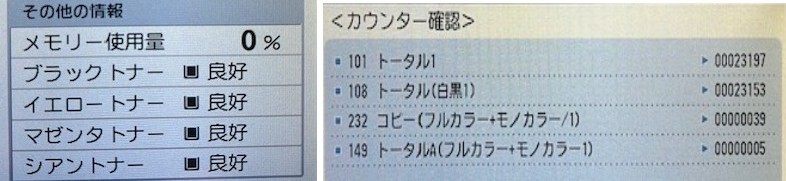 カウンター | トータル:23,197枚 ※落札後発送前に動作確認を再度行いますので、カウンター・トナー残量の数値が多少変動します。ご了承下さい。 |