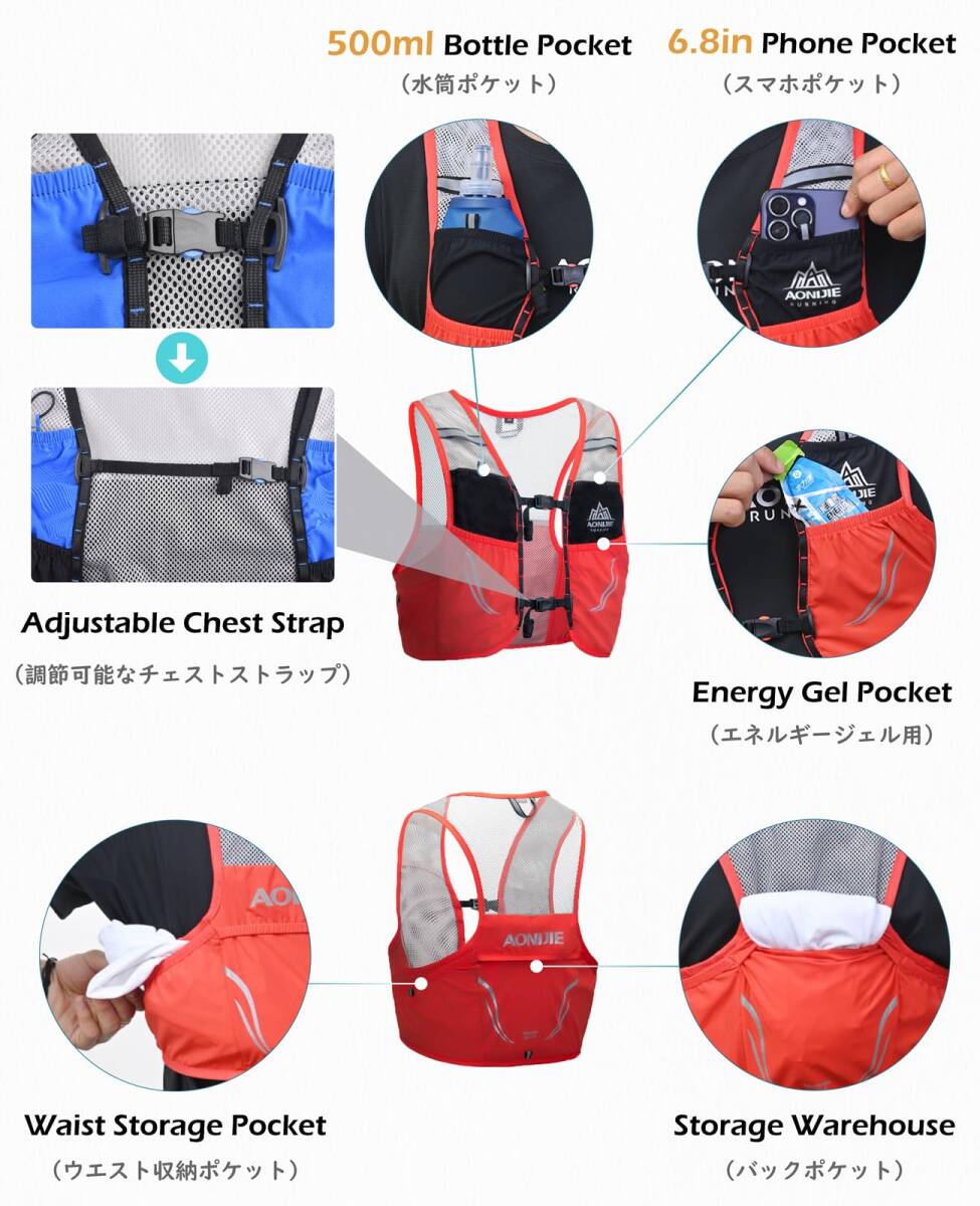 ?【万能ポケット】- 外出先でご必要する用品をすべて収納できるように設計されたトレイルランニング バッグ。ボトル、携帯、鍵、食べ物は簡単に前面のポケットに収納でき、レインコートや着替え用衣料などには後ろのポケットに