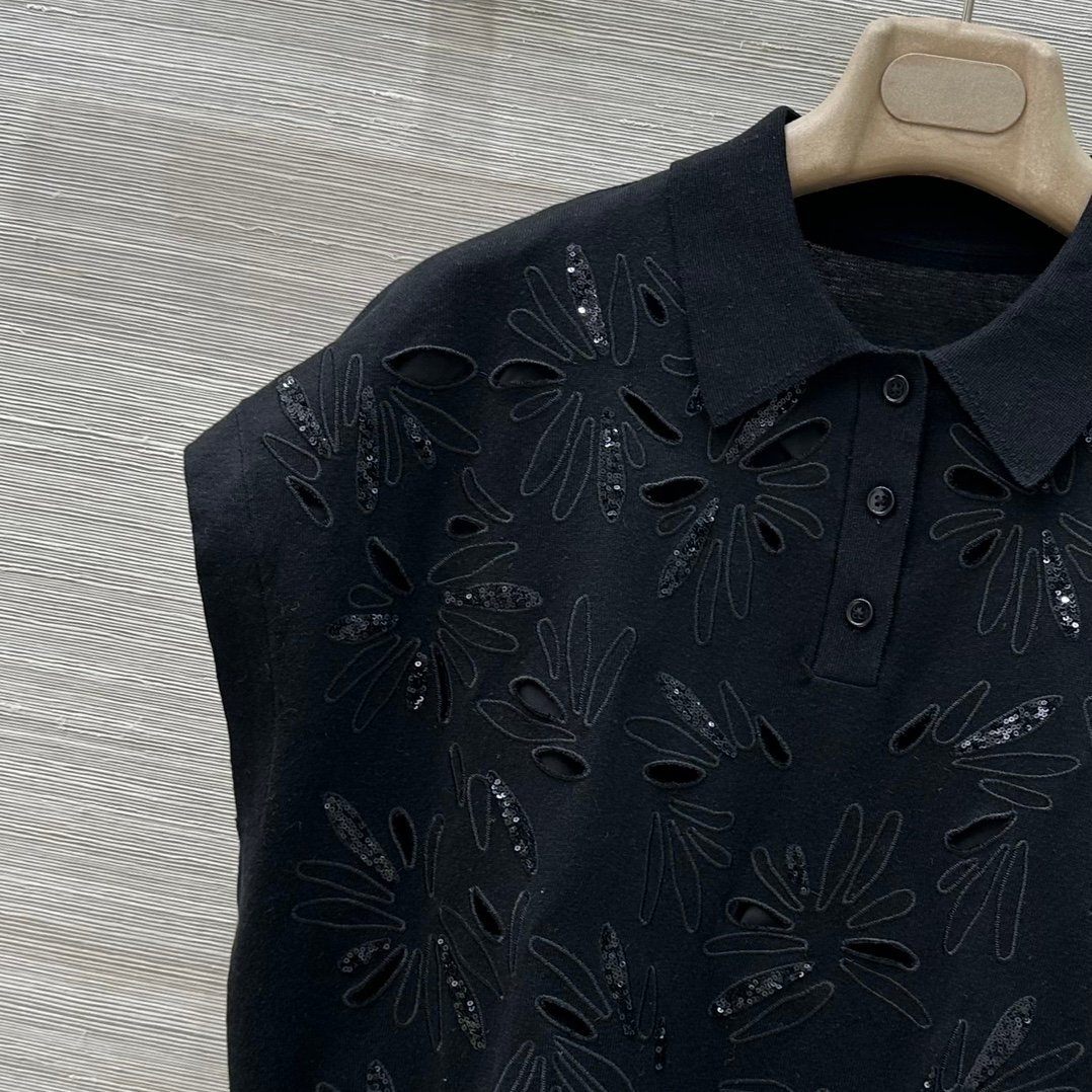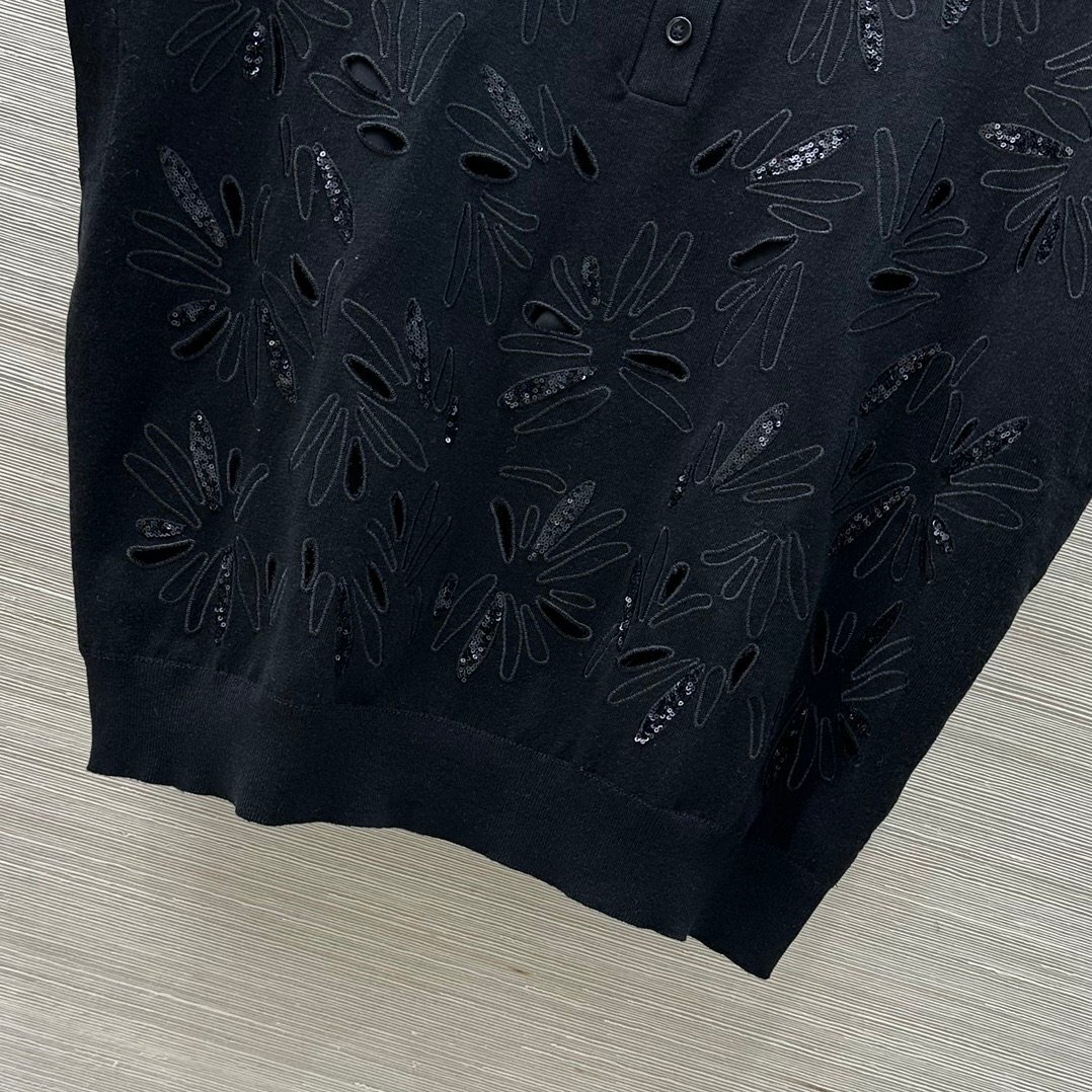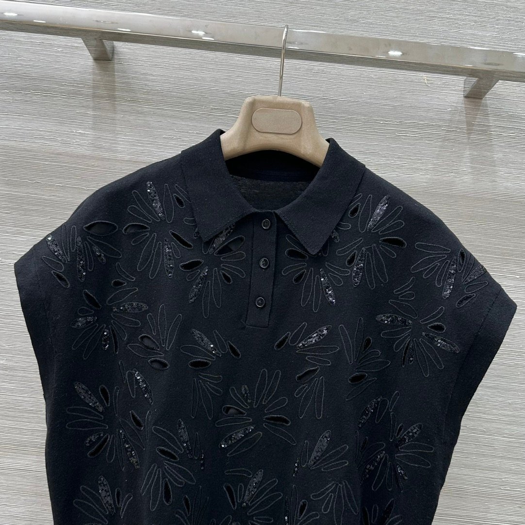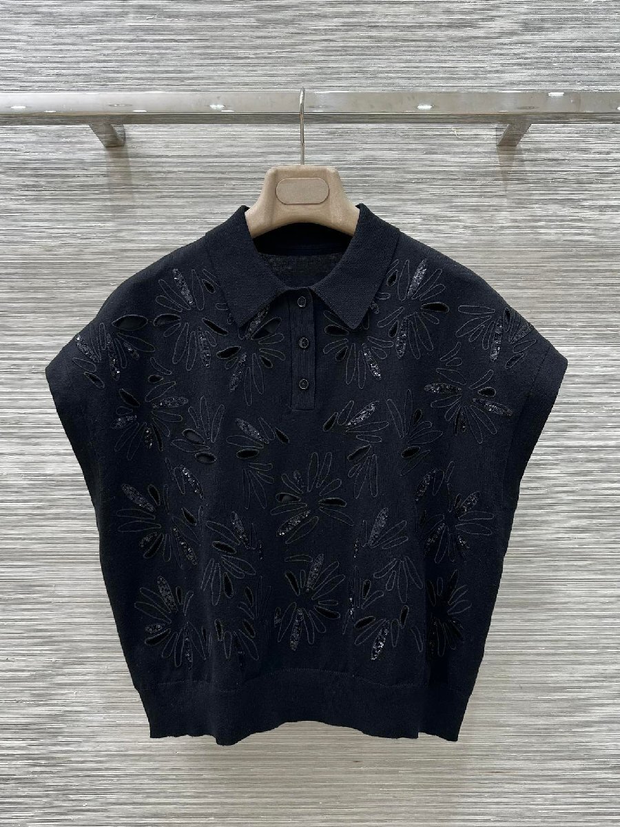 Brunello cucinelli ブルネロクチネリ レディース スパンコール刺繍 透け編みニット ポロシャツ ノースリーブ S- Lサイズ ブラック