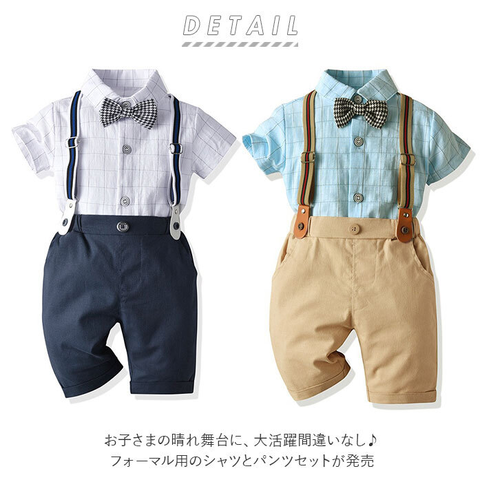 | 商品説明 | ・お子さまの晴れ舞台に、大活躍間違いなし♪フォーマル用のシャツとパンツセットが発売。 ・シャツ、パンツともにお肌に優しい綿混紡素材を使用しているから、着心地抜群♪ ・シャツは、夏でも着用できる半袖タイプ。首元の蝶ネクタイは、スナップボタンで簡単に取りはずしが可能。 ・パンツはウエストゴム仕様で、脱ぎ着が楽ちん。ボタンで着脱可能なサスペンダー付き。 ・セットで着るのはもちろん、単品使いもできちゃうからコーデの幅が広がる◎ 80cm~120cmまでの幅広いサイズ展開。結婚式やお呼ばれ、お誕生日会やお食い初めなど、ベビー&キッズのイベントにもぴったり♪ |