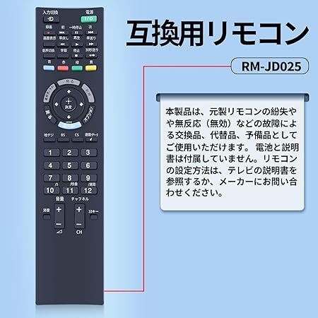 本製品は、SONY製リモコンの紛失や無反応(無効)などの故障による交換品、代替品、予備品としてご使用いただけます。電池と説明書は付属していません。リモコンの設定方法は、本体の説明書を参照するか、メーカーにお問い合わせください。