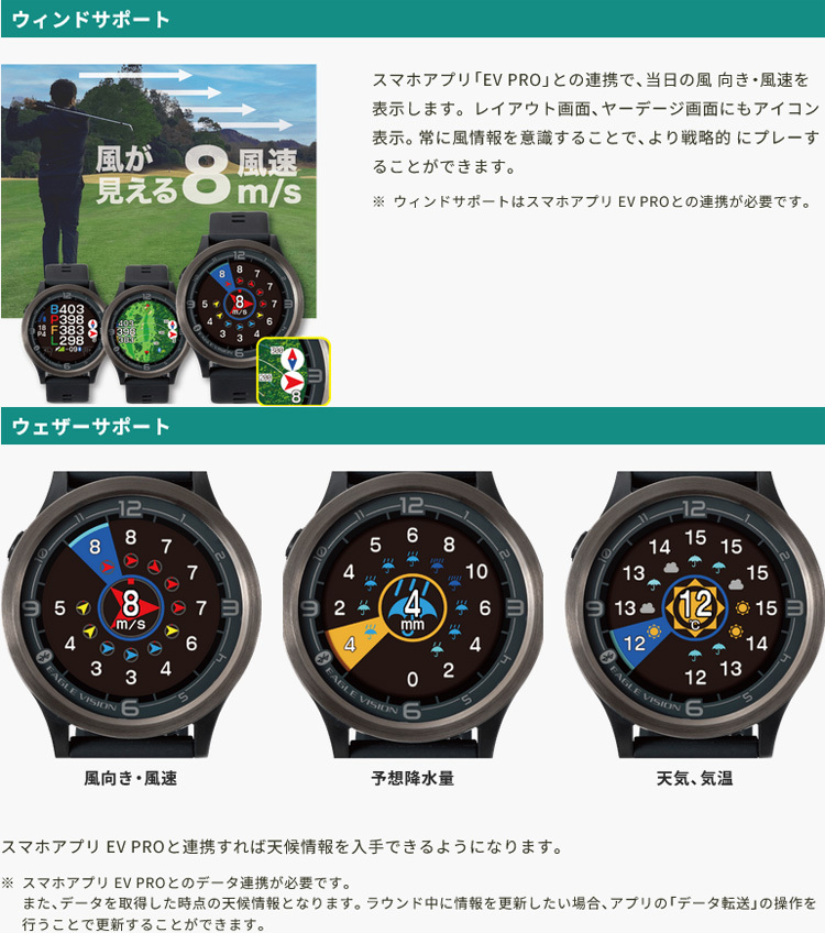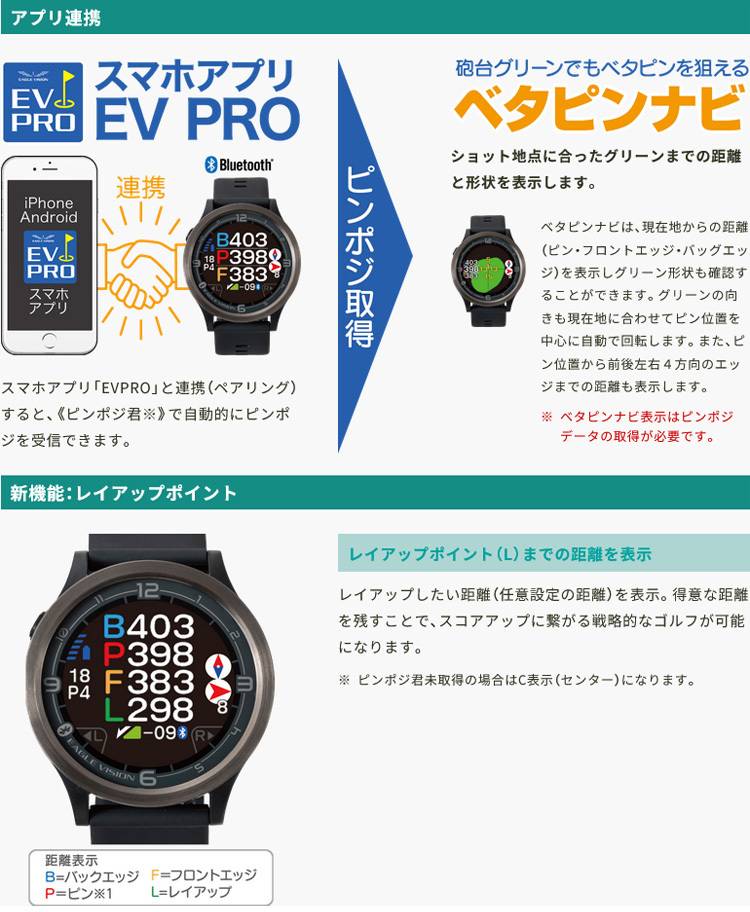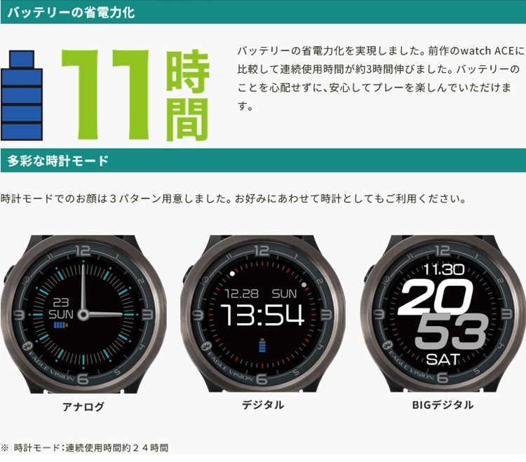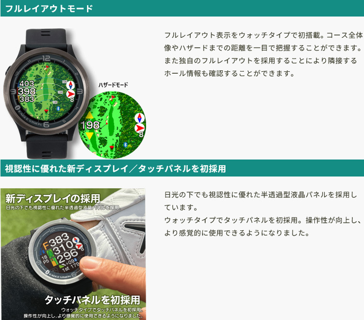 | ■2019年1月1日から、距離計測器の使用がルールで認められるようになりました。より正確な距離が分かるのでさらなるスコアアップが望めます! 『特徴』 ●ウィンドサポート ●ウェザーサポート ●フルレイアウトモード ●視認性に優れた新ディスプレイ/タッチパネルを初採用 ●ベタピンナビ機能 ●アプリ連携 ●新機能:レイアップポイント ●超軽量だからスイングがより快適!→41gの超軽量設計を実現 ●フィット感に優れたインサート式ベルト ●バッテリーの省電力化→使用時間:ゴルフモード/約11時間 ●多彩な時計モード→3パターン用意「アナログ」「デジタル」「Bigデジタル」 【メーカー】朝日ゴルフ株式会社 【商品名】EAGLE VISION ACE PRO イーグルビジョン エースプロ 【型番】EV-337 【カラー】ブラック 【GPS仕様】GPS / GLONASS(グロナス) / MSAS / QZSS(みちびき)L1S信号対応 【通信仕様】BluetoothSMART 【ディスプレイ】240×240ドットカラー液晶 【防水仕様】IPX7 【外形寸法】幅46mm×縦46mm×厚さ15mm 【重量】41g 【電源】Li-ion電池(USB Type-Cから充電) 【使用時間】ゴルフモード/約11時間 時計モード/約24時間 【充電温度範囲】0~40℃ 【動作温度範囲】-10~60℃ 【原産国】フィリピン 【付属品】USB TypeCケーブル、クイックマニュアル、交換用ベルト、保証書(保証期間:1年間) 【商品状態】新品・未使用 ※製品の故障?や修理、データ更新などイーグルビジョンについて分からないことは、朝日ゴルフ用品株式会社 EVサポートセンター TEL:0120-83-1196(フリーダイヤル)にお問い合わせください。電話受付時間 :月~金 午前10時~午後17時(土・日・祝日・会社休日を除く) 朝日ゴルフのイーグルビジョン公式サイトの方も使用方法・スペック詳細・対応コース・サポート・お問い合わせなど内容が充実しておりますので、是非ご活用ください。 ※ノークレーム・ノーリターン・ノーキャンセルでお願いいたします。 |