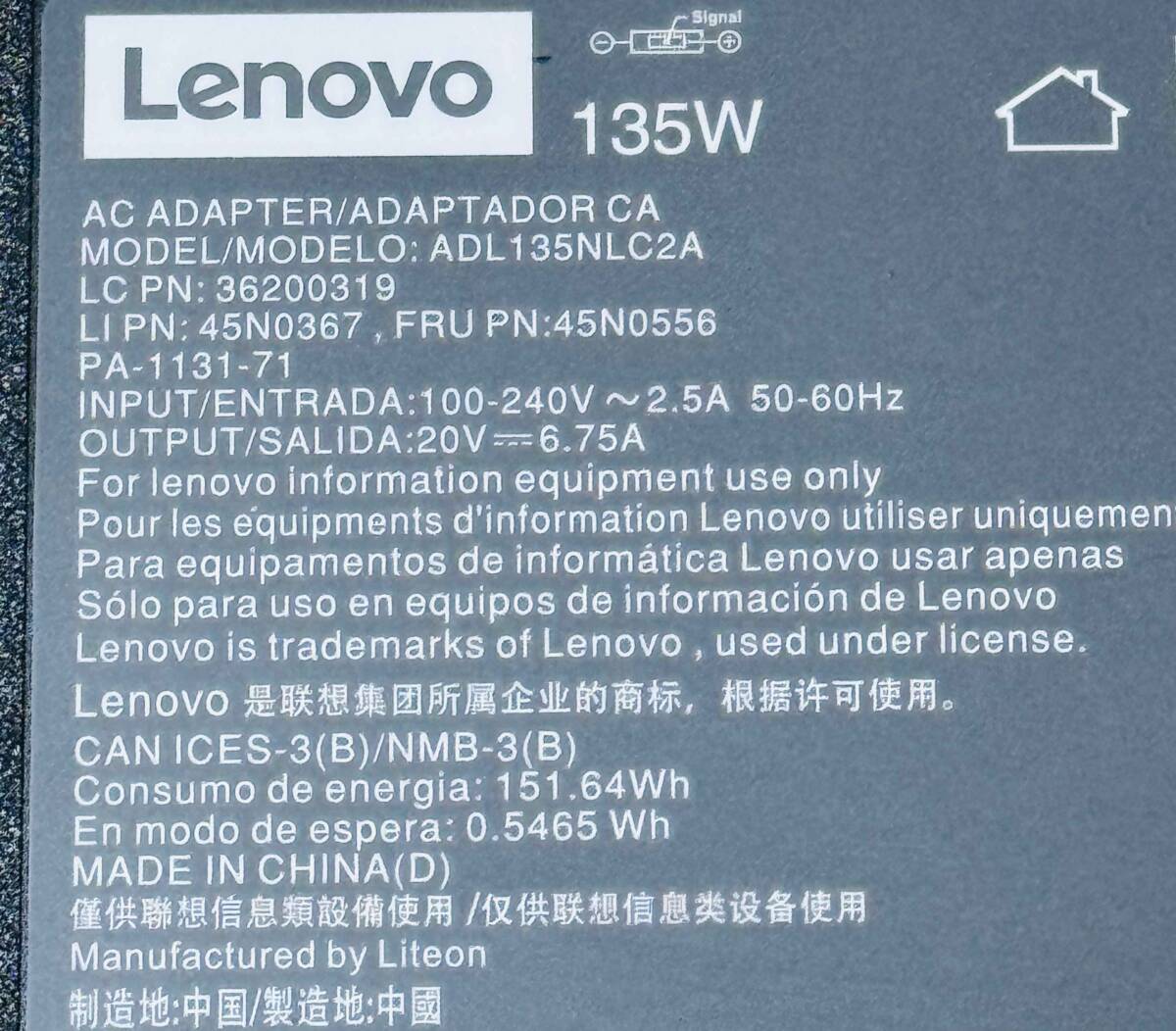 動作品  純正  Lenovo 135W ACアダプター 20V 6.75A