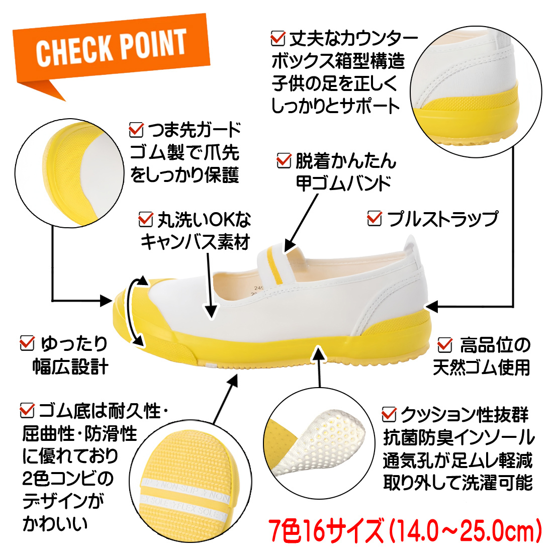7色のカラーバリエーション、14.0cm~25.0cmと豊富なサイズをご用意しました。デザイン性と機能性に優れて、子供に喜ばれる一足です。