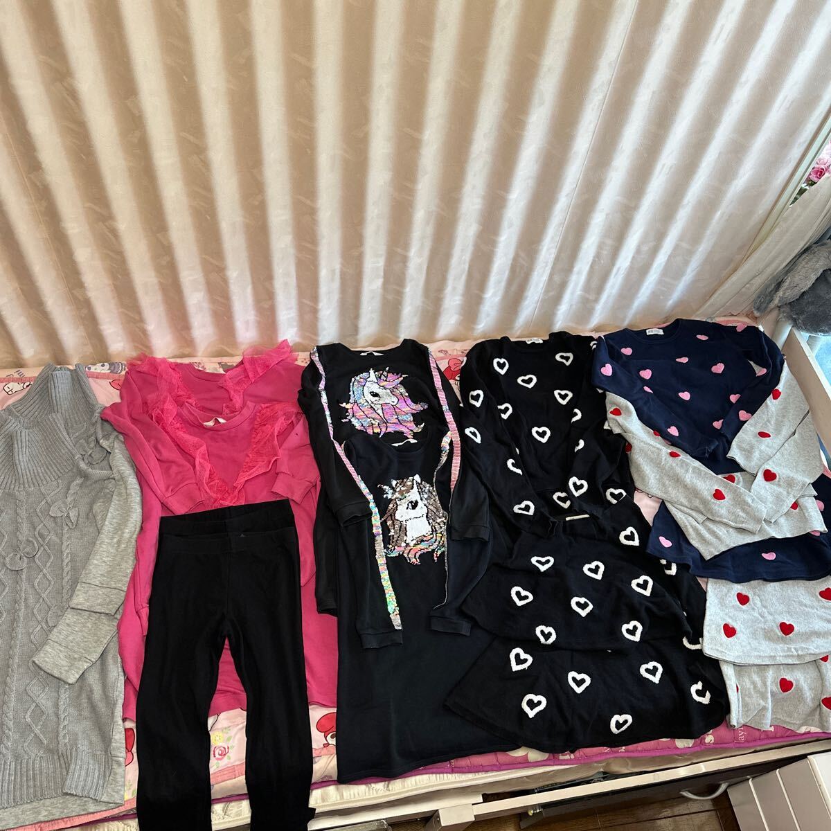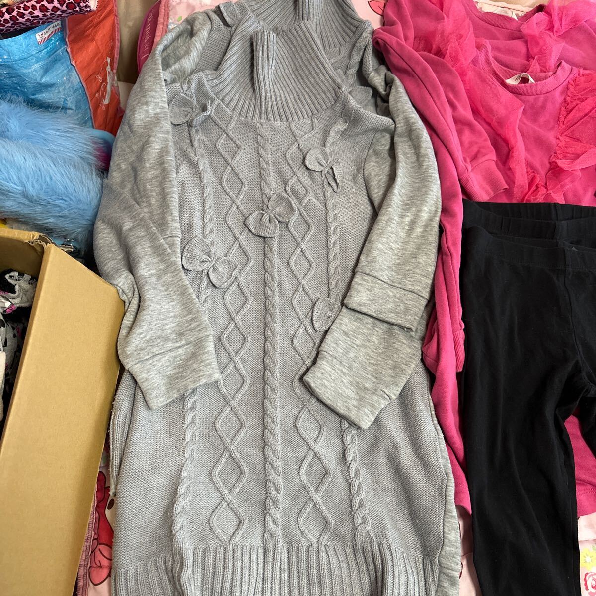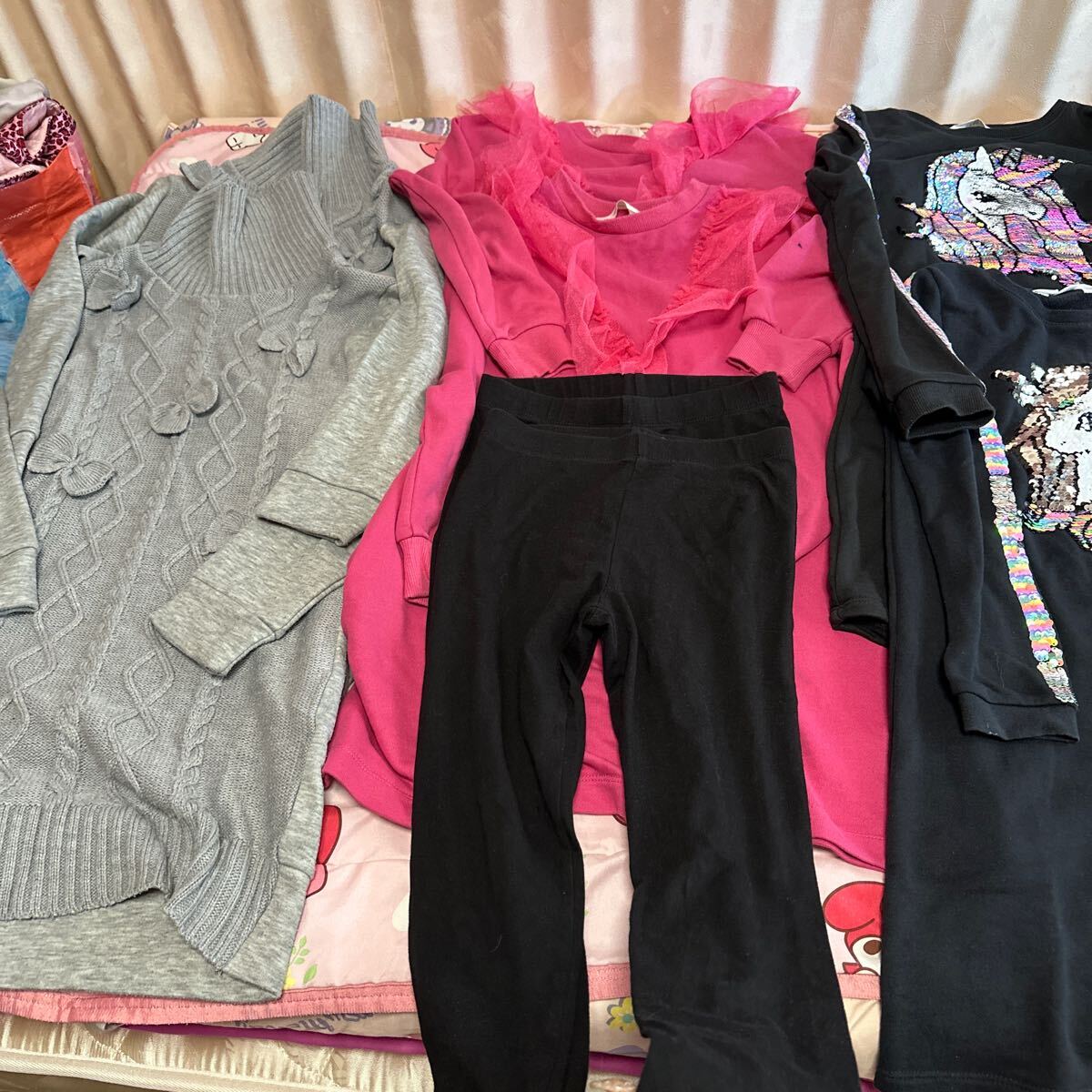 写真2番左:H&M140cm。上は薄手のトレーナー生地。下は綿のスパッツ。春秋に7-8回位着用。着丈70cm。