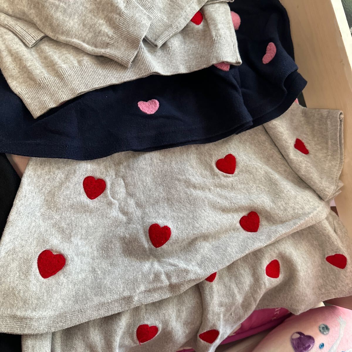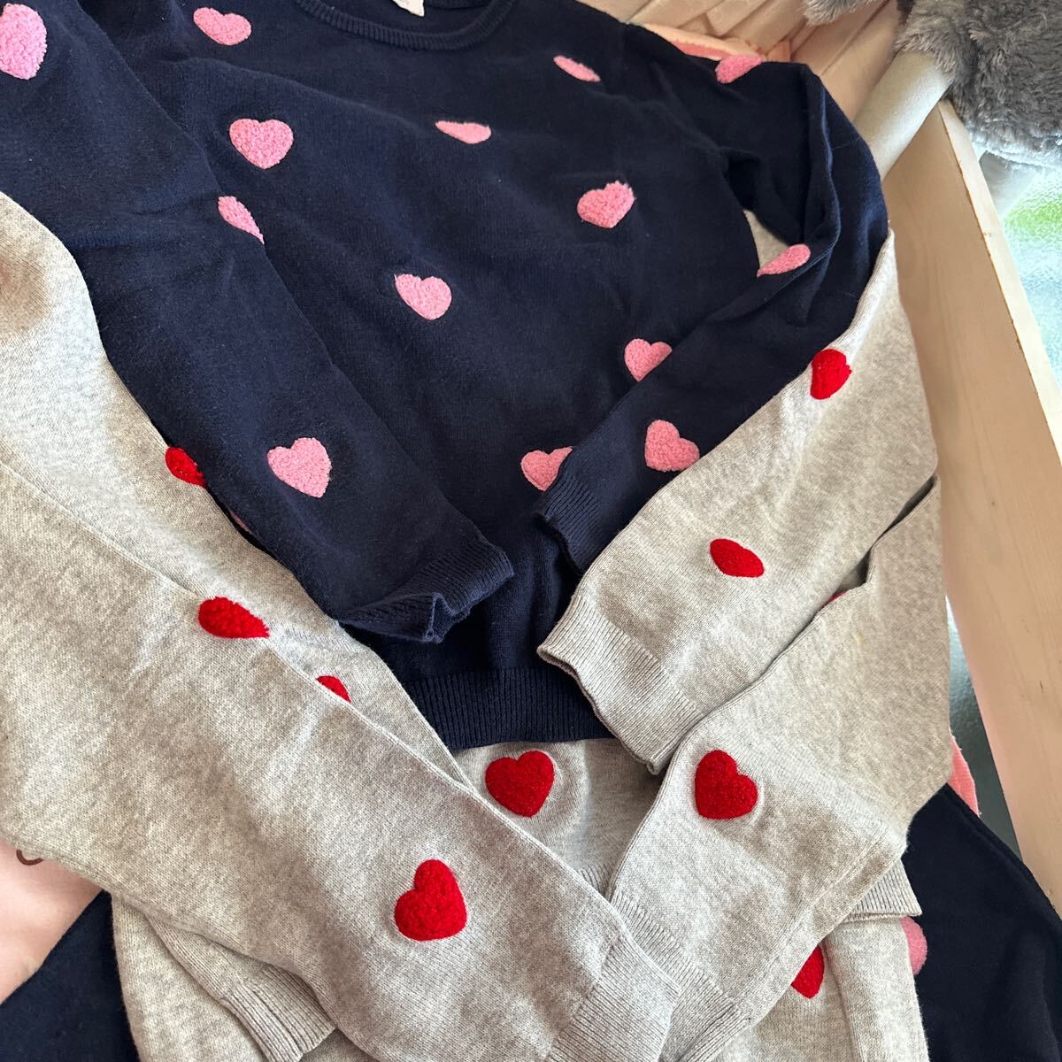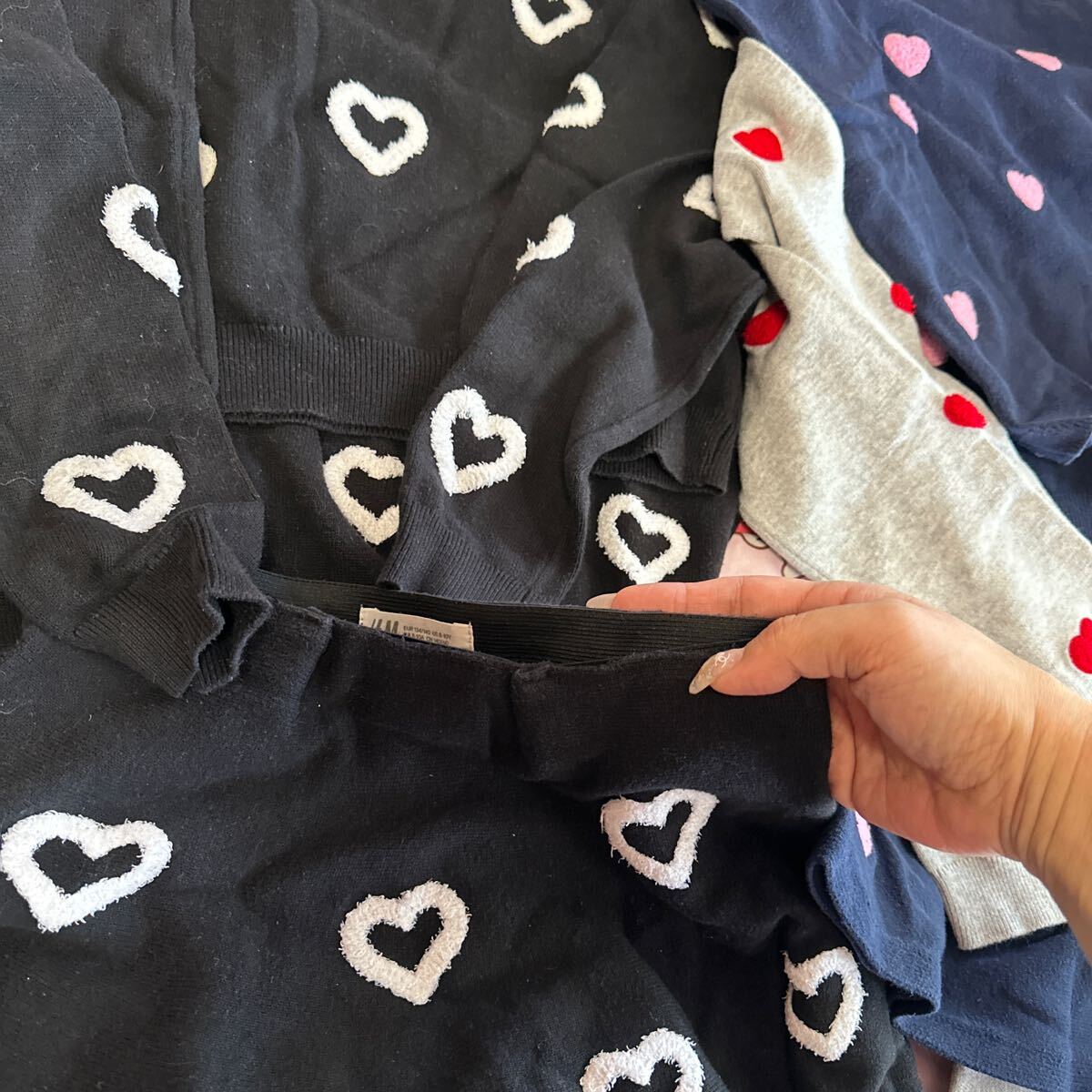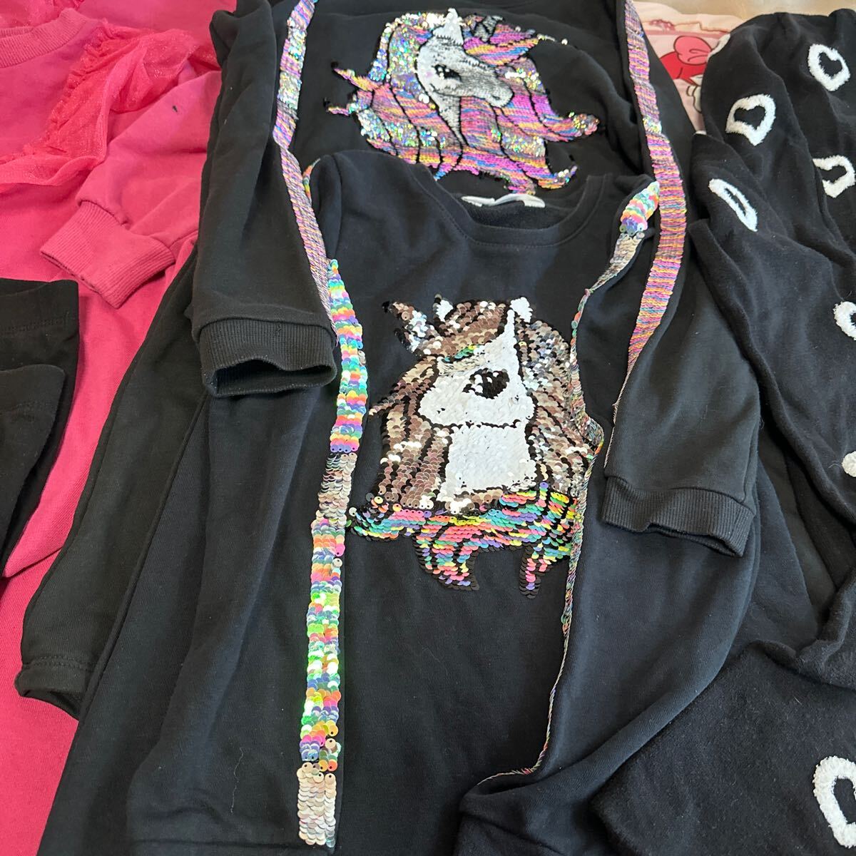 写真真ん中:H&M134-140cmですが大きめで140cm着用時に着てました。トレーナー生地。上は黒、下はネイビー。袖も胸元もスパンコールの色が変わります。着丈74cm。