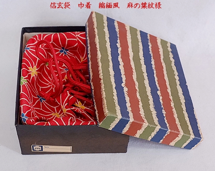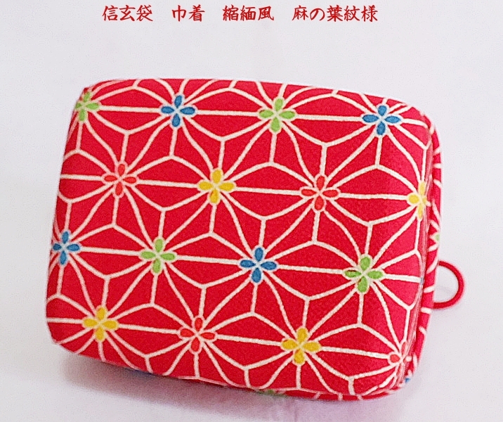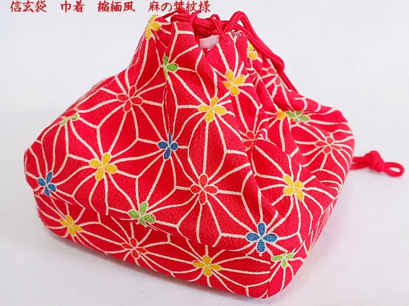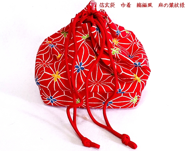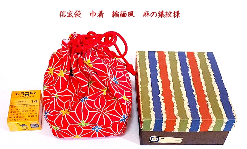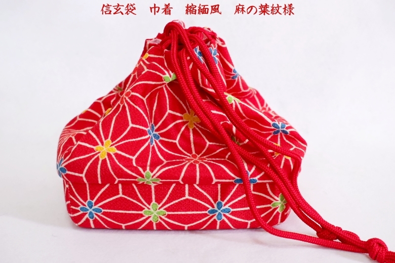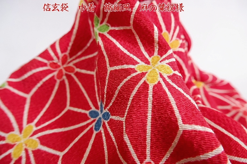 信玄袋 巾着 縮緬風 麻の葉紋様 USED
