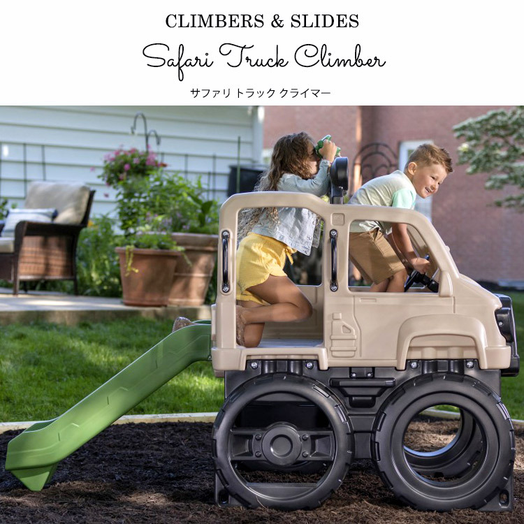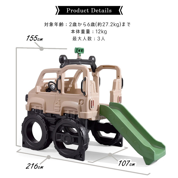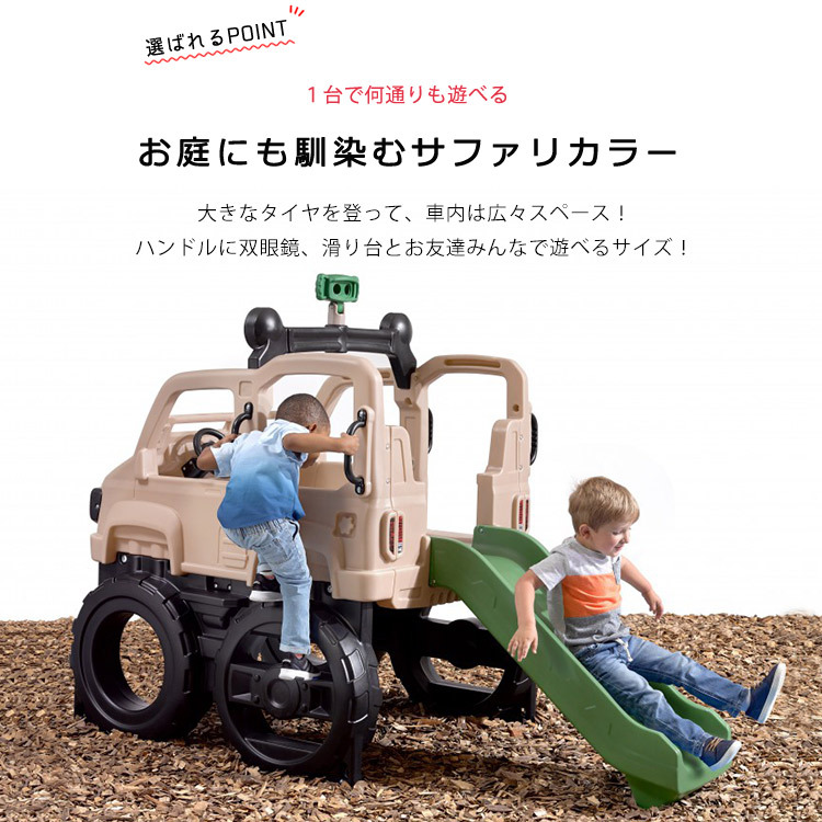 | 仕様 | お庭に子供たちが大好きなジャングルジム! カッコいいサファリカラーのトラックのタイヤを登ったりくぐったり トラック内部には広々スペースがあり、 双眼鏡を覗いたり、 ハンドルをぐるぐる回して、まるで冒険家!! 広々スペースからはすべり台で降りてこよう! 下は隠れ家として! 子供たちだけの、子供らしい遊びで筋力UPや社交性を育もう!! |