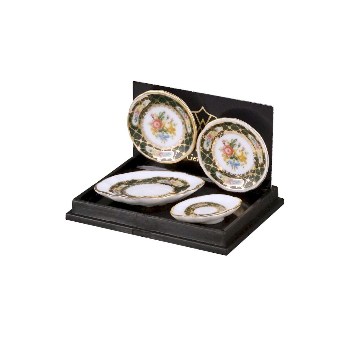 ドイツ ロイター社のミニチュアです。ディナー用のお皿4枚セットです。このお皿、とってもすてきですよ~! 丸いディナープレートの直径約21ミリ。楕円皿大35x25ミリ。楕円皿小23x15ミリ。アクリルケース入りです。アクリルケースのサイズ:W55xD42xH35。アクリルケースのサイズ:W80xD55xH48ミリ。