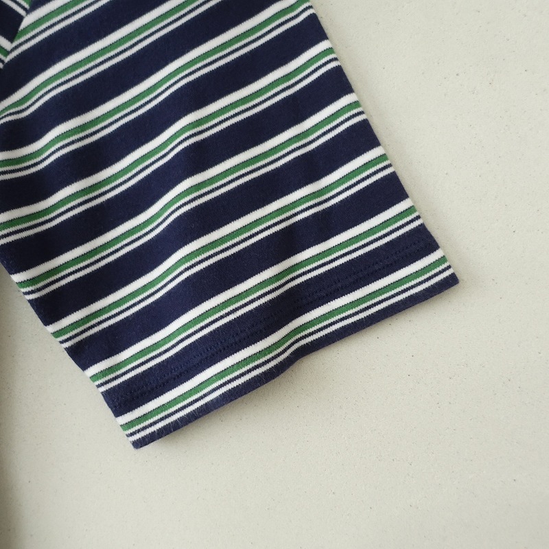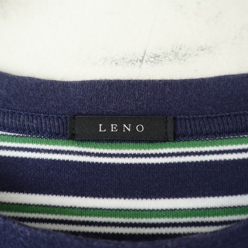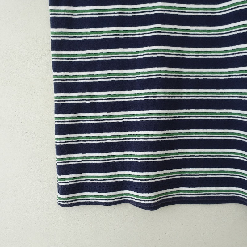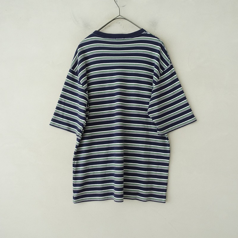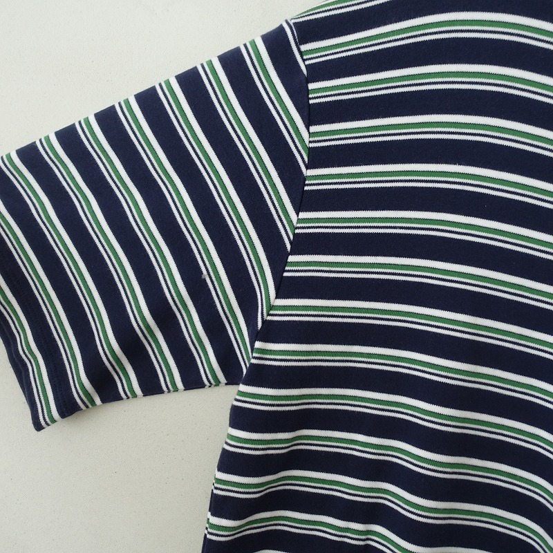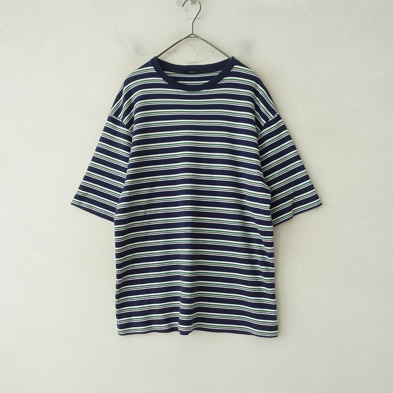 | LENOのマルチボーダービッグTシャツです。カラーはネイビー・ホワイト・ライトグリーンで、もっちりとした質感のマルチボーダー織地で仕立てられております。 |