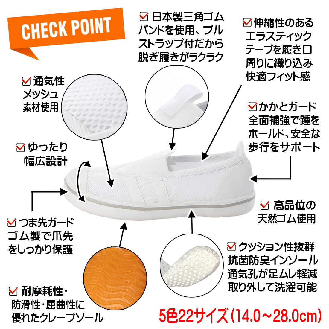 5色・22サイズのバリエーションを豊富に用意しており、子供から大人まで対応。通園・通学・通院・研修での使用はもちろん、リハビリ・介護など、幅広い場面で活躍する一足です。