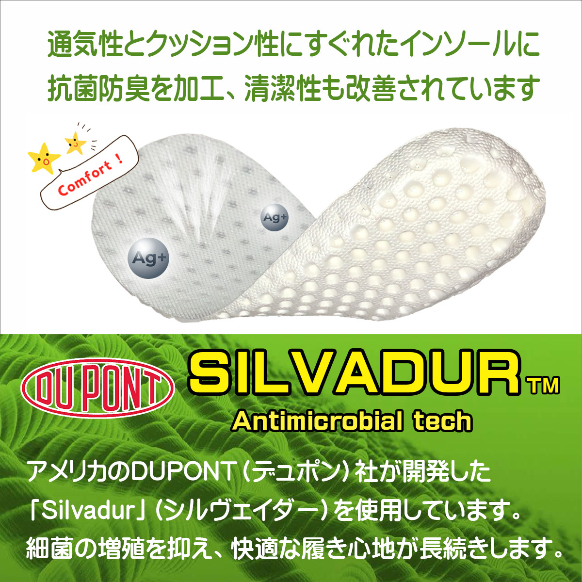 カップインソールには通気孔の加工をしており、クッション性が良く足裏の通気性抜群。アメリカデュポン社の薬剤を使用して抗菌防臭加工も施されており、取り外して丸洗いが出来るので、靴を清潔を保つことが出来ます。