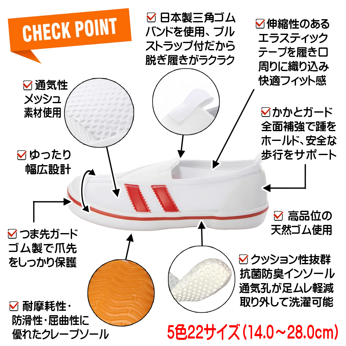 5色・22サイズのバリエーションを豊富に用意しており、子供から大人まで対応。通園・通学・通院・研修での使用はもちろん、リハビリ・介護など、幅広い場面で活躍する一足です。