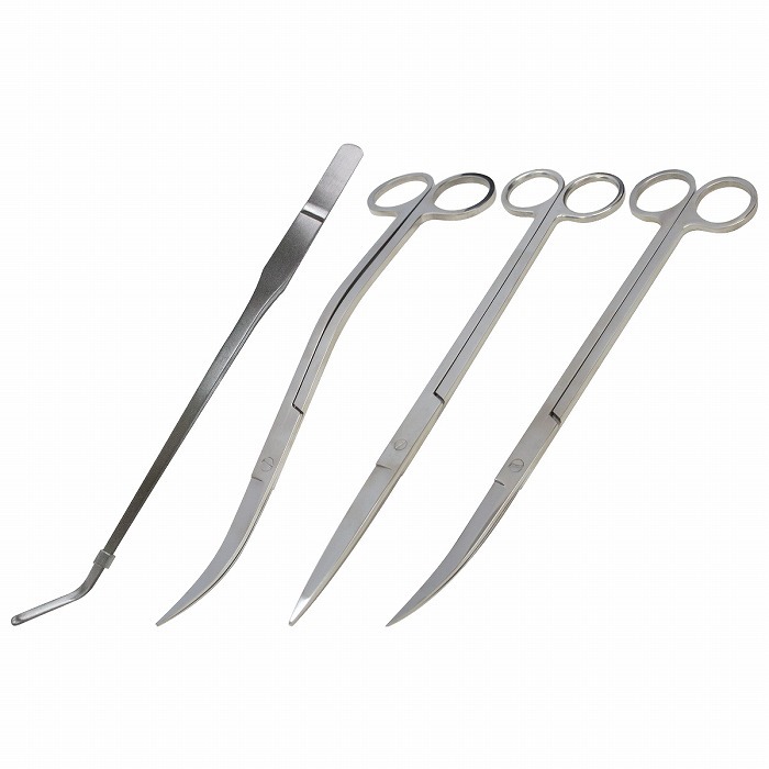 4点セット 【250mm 25cm ハサミ 3種類 & 270mm 27cm ピンセット 先端カーブ 】 水槽 水草トリミングキット