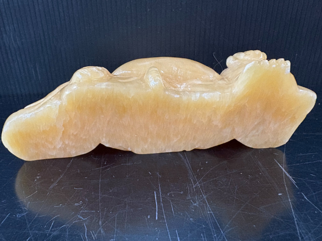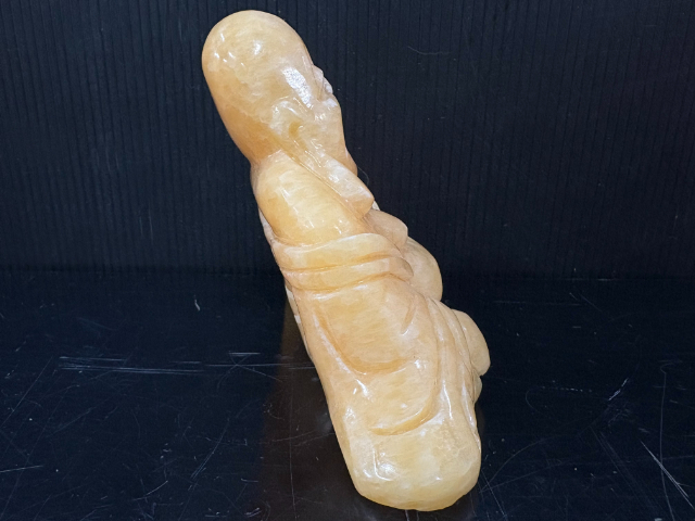 【中国古玩】 玉石製 布袋様 七福神 黄玉 天然石 縁起物 彫刻 木製台付(M7718)
