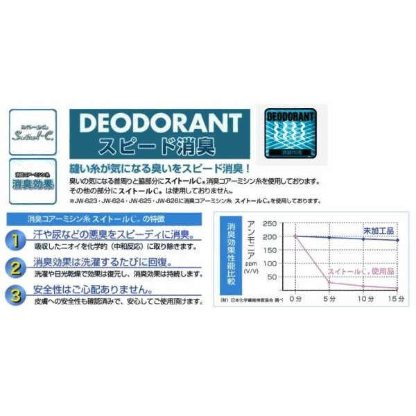 臭いの気になる首回りと脇部分に「スイトールC」消臭コアーミシン糸を使用
