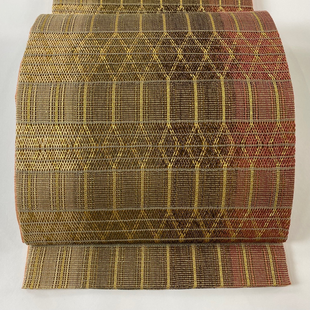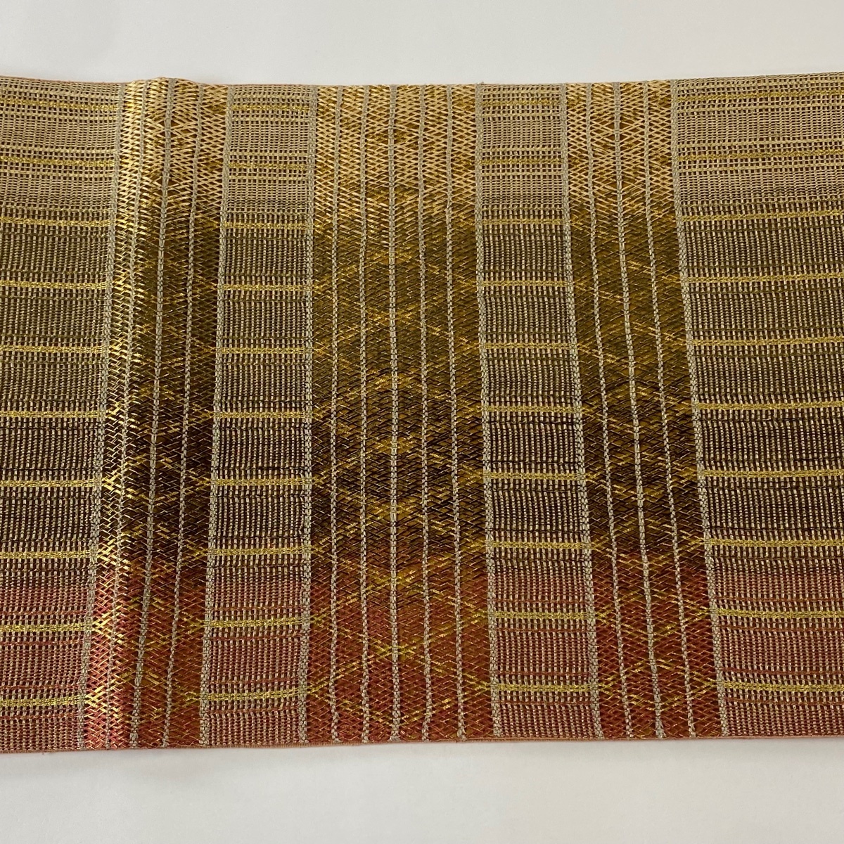 | 袋帯 美品 秀品 縞 菱 金糸 茶緑色 お太鼓柄 正絹 【中古】 |
