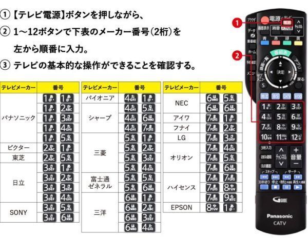 設定することで画像3枚目表の各メーカーのテレビの基本操作も可能です。 ●対応機種 TZ-HDW600 TZ-HDW610 TZ-HDT620 TZ-HDT621 ■ 商 品 状 態 ■ 使用感は殆どなく極美品で新品同様です。 ボタンの反応も新品時と変わらずサクサク操作できます。 ※商品到着日から7日間保証いたします。不具合は交換で対応いたします。 ※発送に際して、厚みがネコポスサイズのギリギリの為、商品を直接梱包袋に入れての発送となりますことをご了承の程お願い致します。 #Panasonic #CATV #STB #N2QAYB000901 #N2QAYB001004 #N2QAYB000526 #代用品 #互換性 #TZ-HDW610P #TZ-HDW620PW #TZ-HDW610F #共用