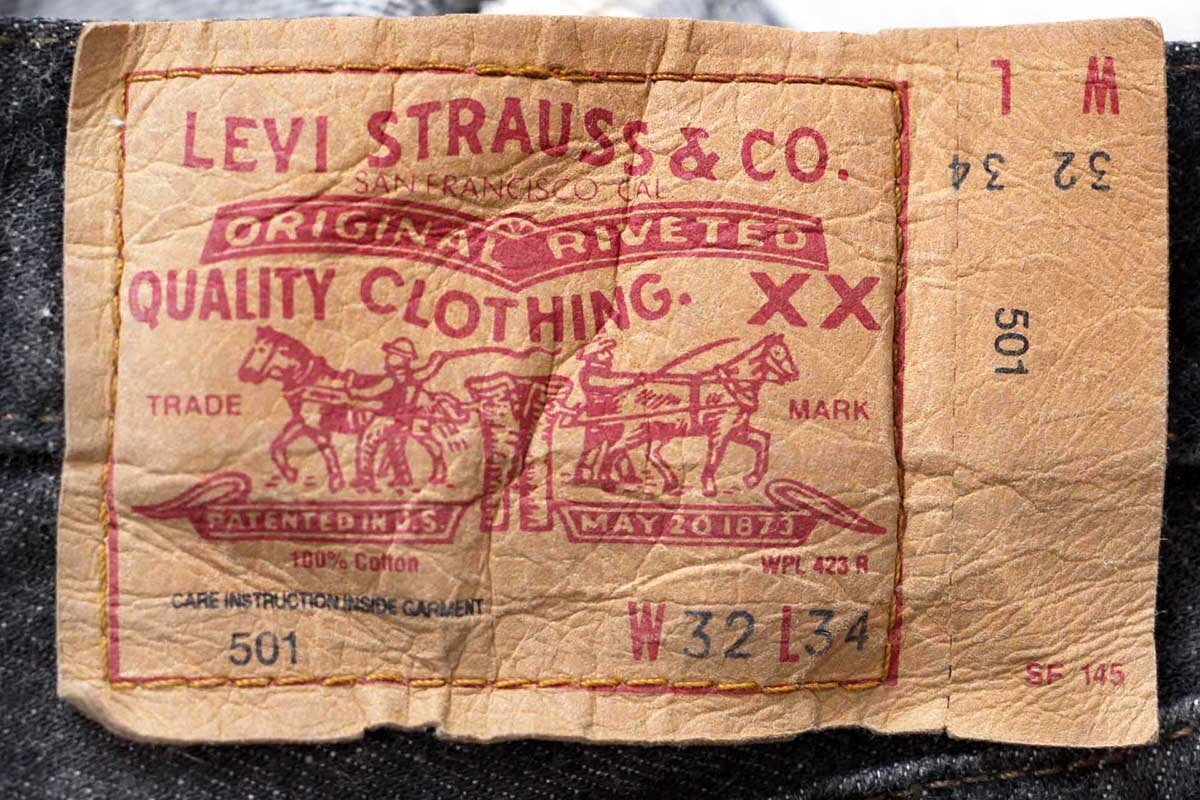 赤タブスモールe、トップボタン裏刻印292、フロントボタンフライ、サイド脇割り、紙パッチにCARE INSTRUCTION INSIDE GARMENTのスタンプあり