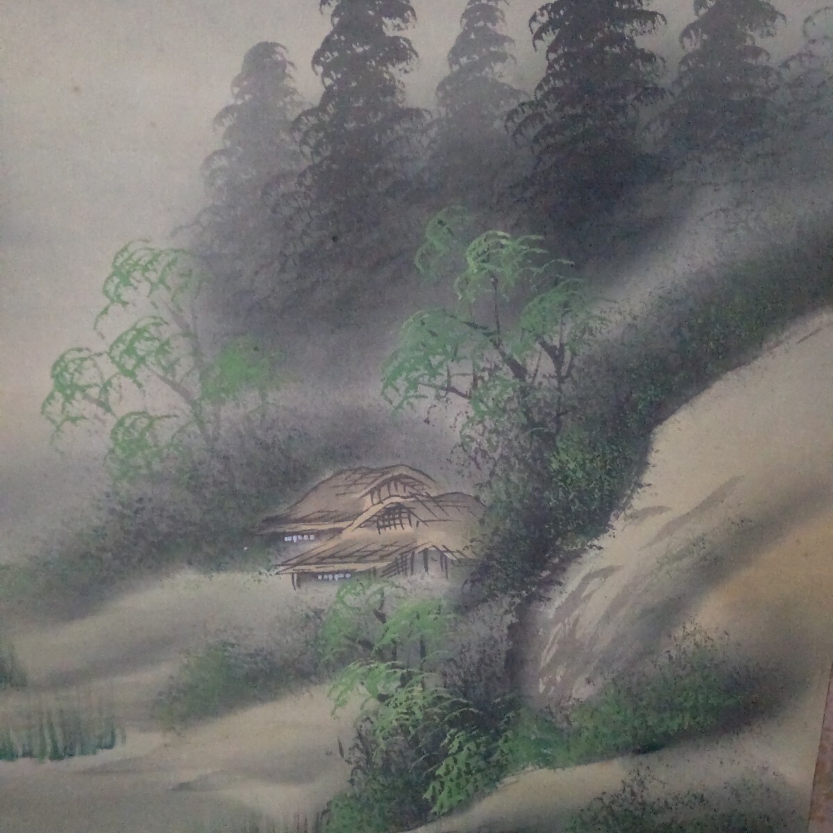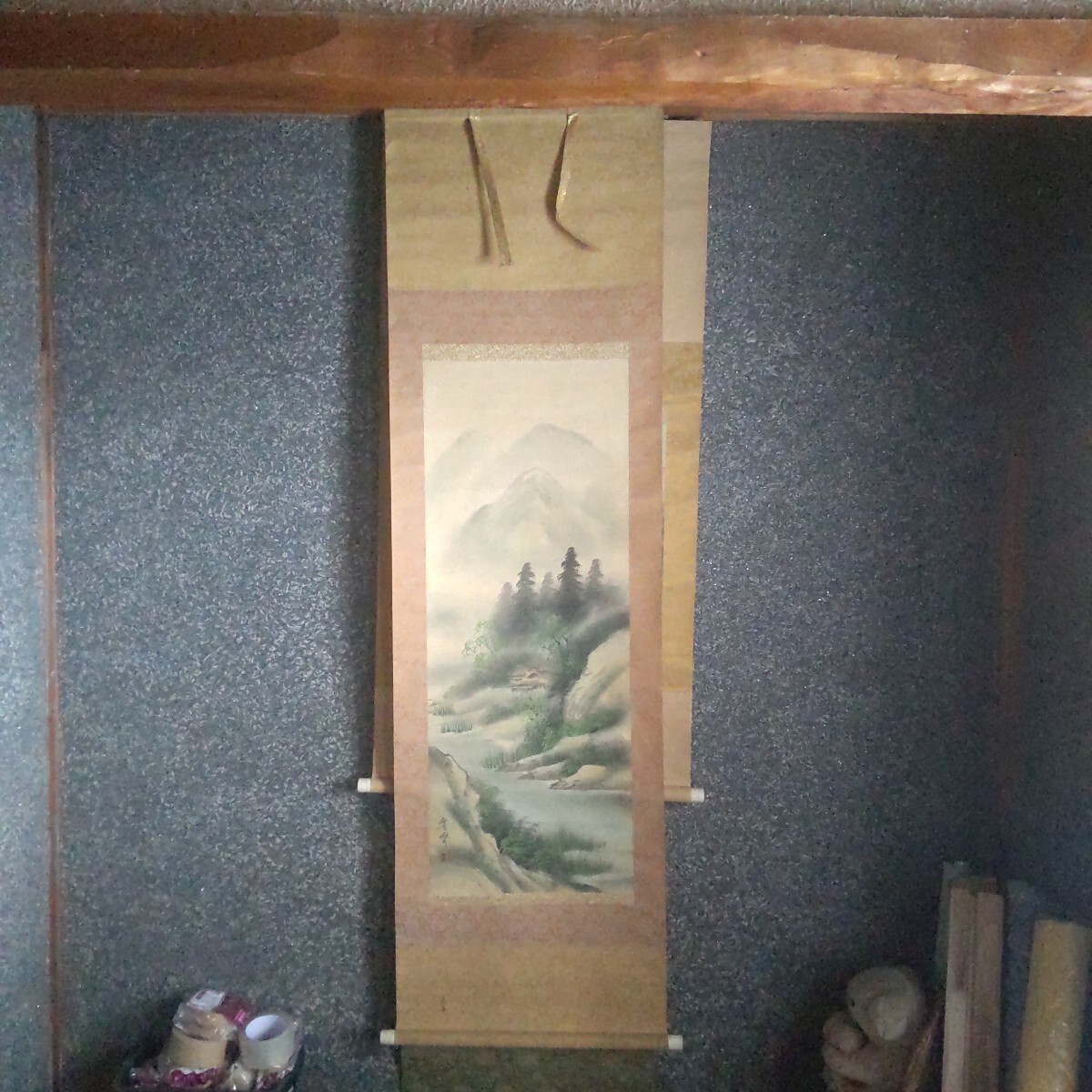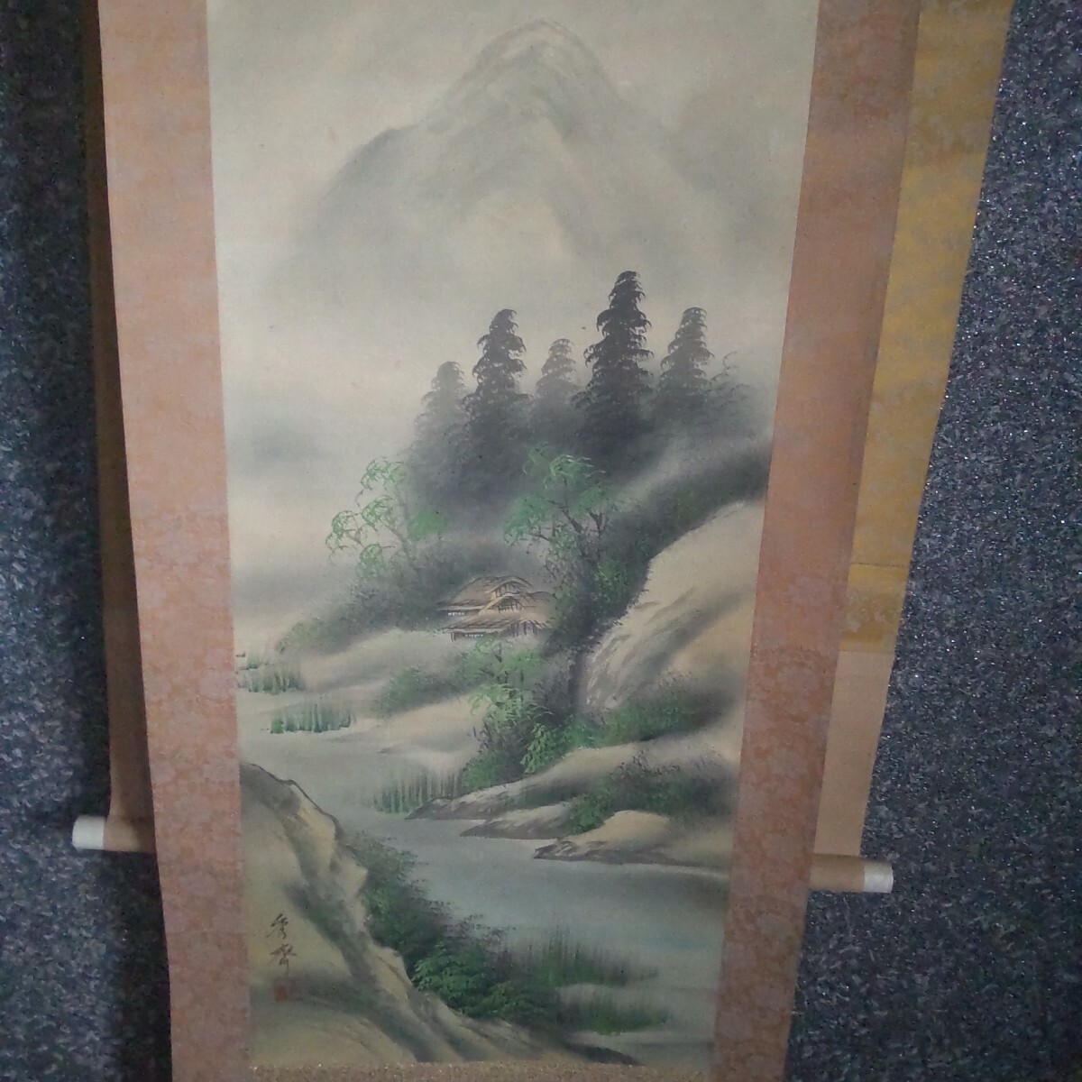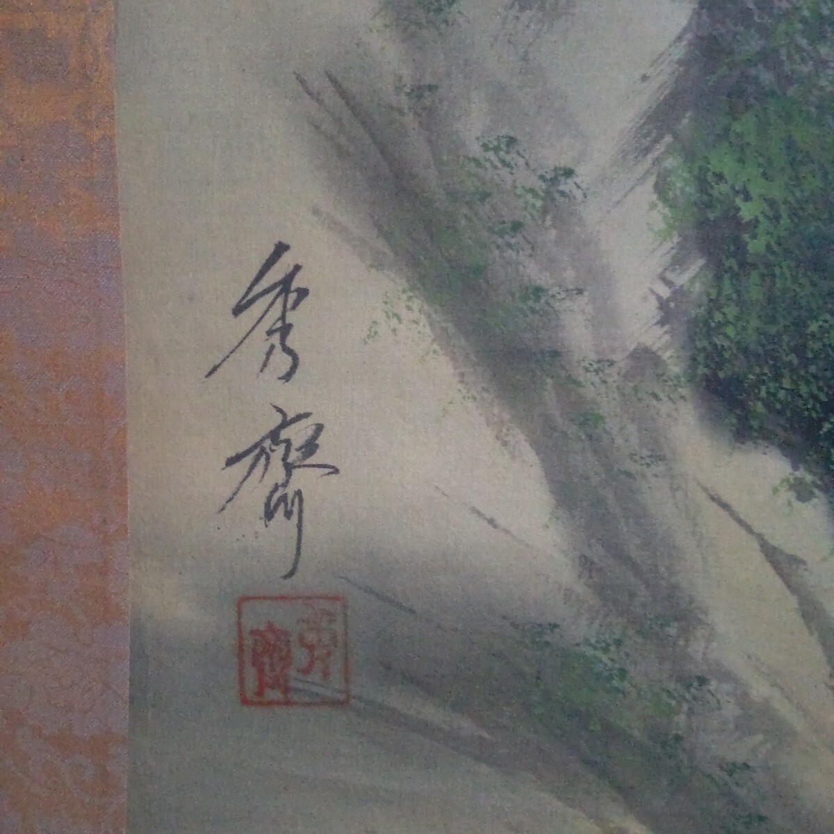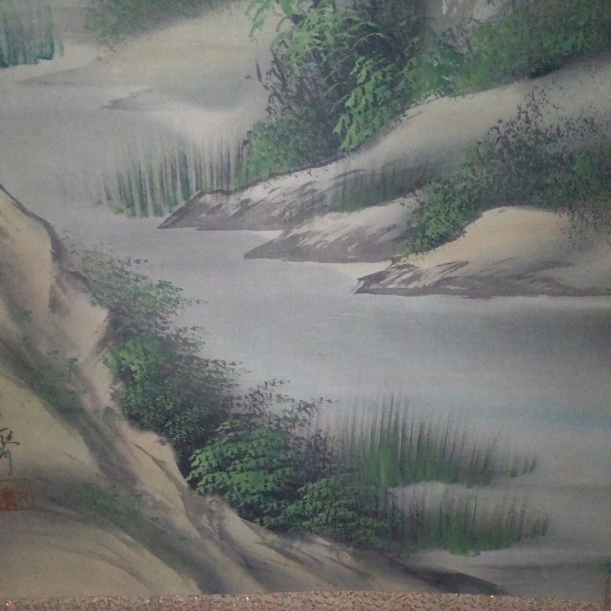 保管品の山水画です。秀斎の銘印有ります。直筆。状態良好です。薄いタッチの山や、川が涼しげな品に成ります。残念ながら箱有りません。別箱にて発送に成ります。当方知識が有りません。お好きな方インテリアに。幅50xH168cmです。