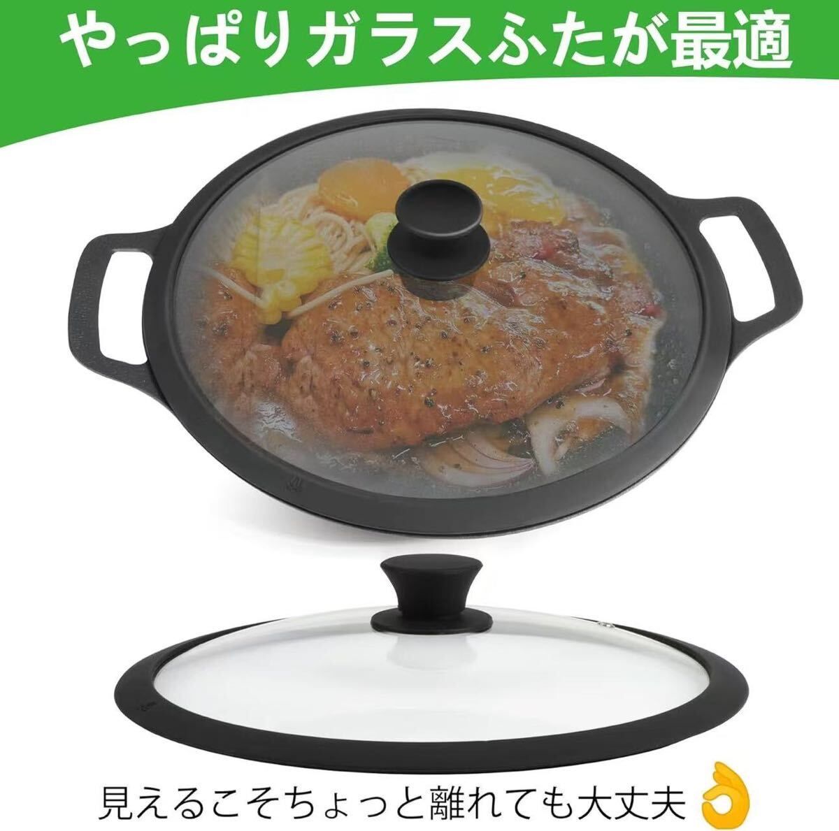 【調理物丸見え】ガラス蓋だから食材の火の通り具合や、裏返すタイミングがひと目でわかるのが使いやすい。またある程度の重みがあるのでフタも浮きにくく、安心安全