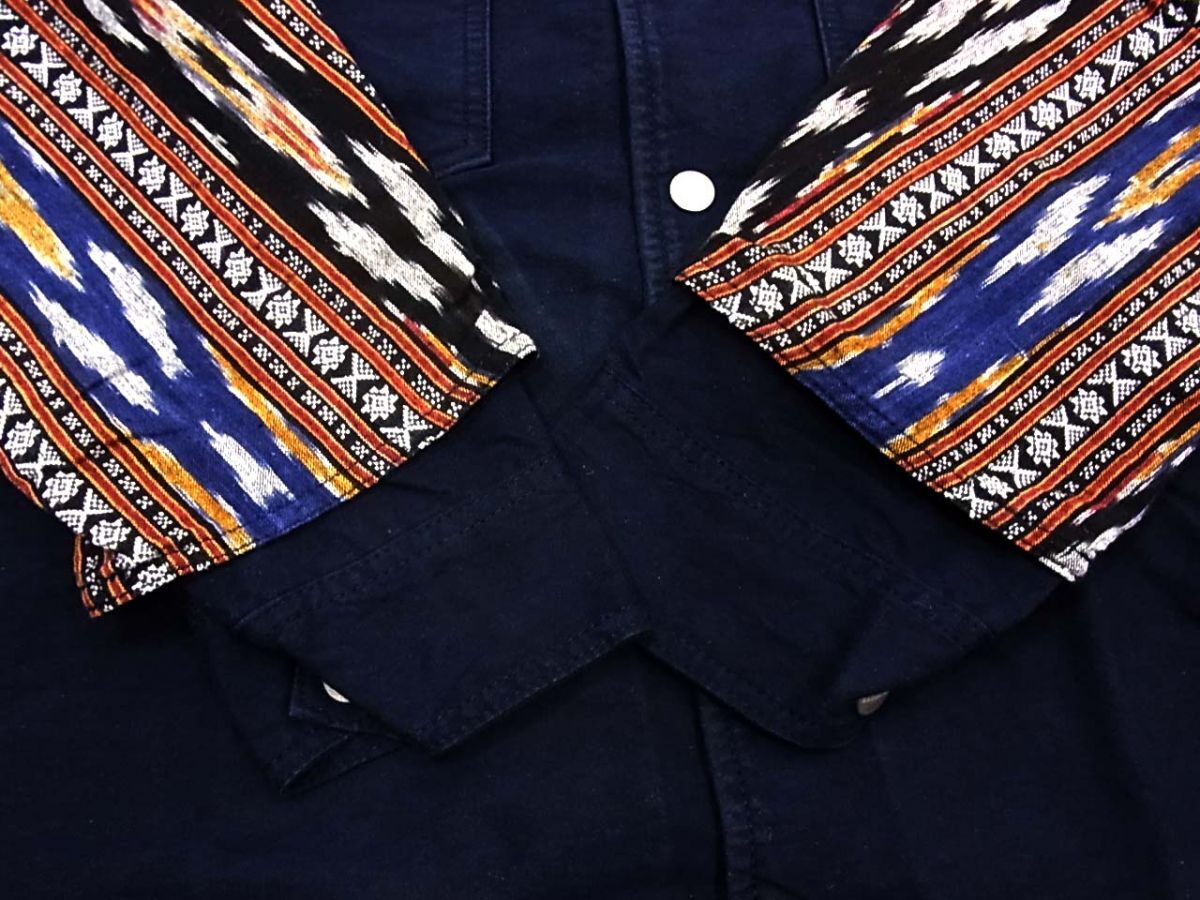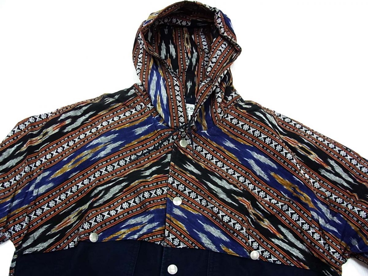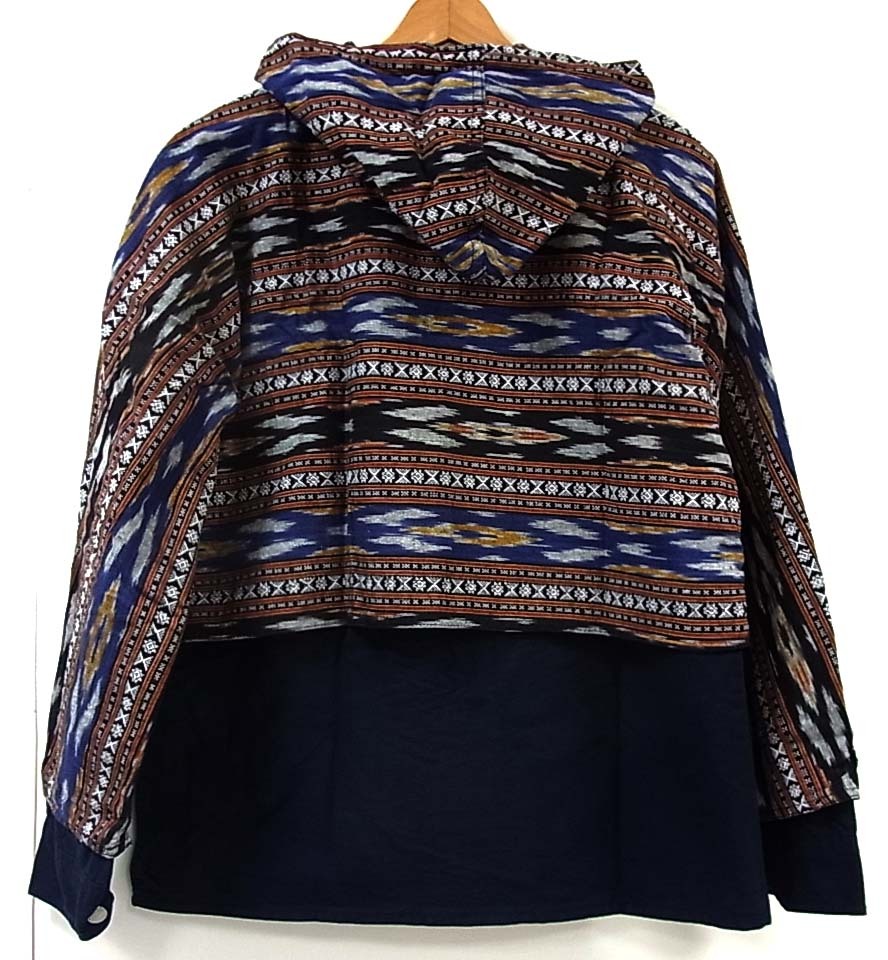 備考ロガージャケットがベースになっており、襟口から胸、腕、パーカーにかけて絣、イカット地で包み込む仕様になっています。