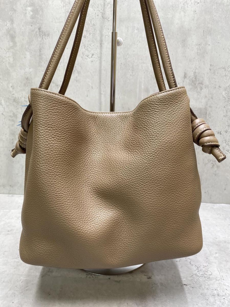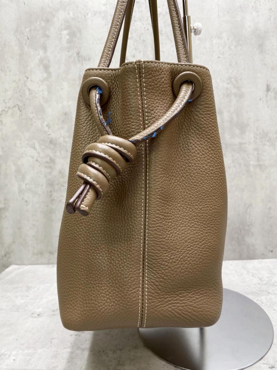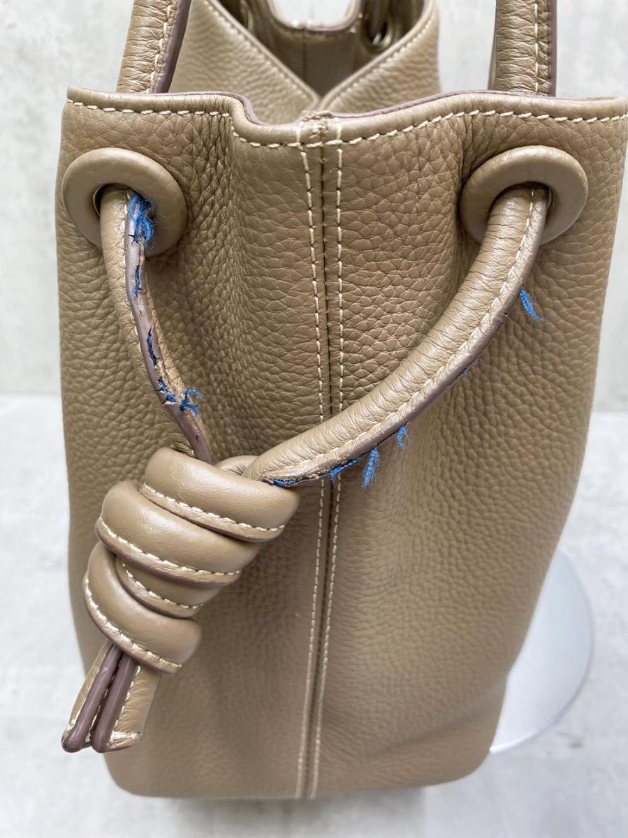 商品の状態 | 持ち手の結び目側にコバの破れ・中の素材の露出があります。 底面に汚れがあります。 使用感がございますが、まだまだ活躍してくれると思います。 (当方管理番号:syfg118155-t) | ||||||||