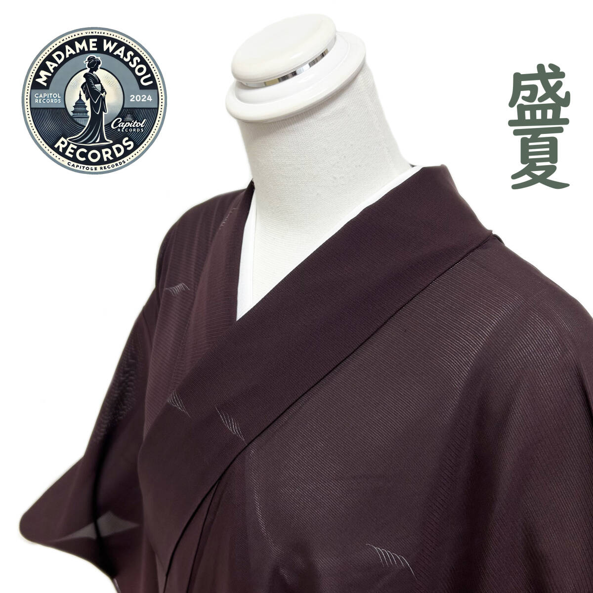 着物 単衣 正絹 小紋 絽 盛夏用 カジュアル ワインカラー 紫鳶色 中古 仕立て上り Sサイズ MWR-No.177 15072025 マダム 和装