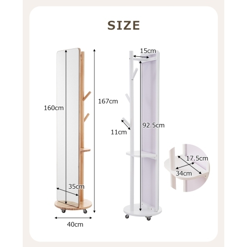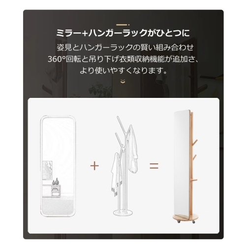 • 姿見とハンガーラックの賢い組み合わせ360°回転と衣類収納機能が追加され、より使いやすくなります。