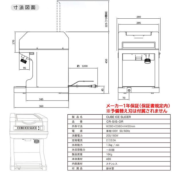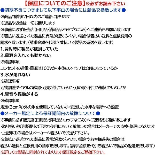 ![]() 業務用アイススライサー(電動かき氷機) 日本製電装部品使用 高品質ステンレス刃使用 ![]() ![]() ★コンパクト&ビッグパワー★ ●外観はコンパクトでありながら業務用で使用できるビッグモーターを採用 ●爽やかなホワイトカラー ●A3サイズに収まるサイズでコンパクトな厨房にも収まるサイズです ●本体重量16Kg ★省エネ&振動低減★ ●本体剛性と共鳴パーツの改良により大幅な振動と騒音の軽減に成功しました ※使用する氷の形状・大きさ・温度・成分と外気温などの条件により変動致します ※上記結果は製造メーカー工場により測定した条件をもとに算出しています ●業務用でありながら業界最少電力クラスの200Wという消費電力を実現!! ●振動は従来機と比較すると約40%減になりました。(同一メーカー比) ★大容量&大型回転翼★ ●どんぶり鉢いっぱいの氷が収納できる大型投入口を採用 ●製氷機の氷であれば約60個が収納できます(氷寸法30X30mm) ●毎分の処理能力は毎分1.3Kg ●約200gのかき氷を1分間に約6杯分作れます ●連続稼働時間:約40分 ●再始動までの待機時間:約30分 ●回転翼の厚みは従来比150%アップ ●強度アップと静音性に一役かっています ★安全スイッチ★ ●改良型の安全スイッチを採用!! ●アイススライサー動作中にフタを開けると安全スイッチが作動し運転がストップします 【商品仕様】 製品名:なごみ CUBE ICE SLICER 品番:CR-SIS-OR 外形寸法:W280×D360×H450mm(蓋開け時675mm) 電源:単相100V 50Hz/60Hz 消費電力:200W/180W 定格電流:2.7A/2.0A 氷削能力:1.3Kg/min 氷収容量:約60個(氷寸法30X30mm) 連続稼働時間:約40分 再始動までの待機時間:約30分 本体重量:16Kg 本体素材:ABS樹脂 内部素材:ステンレス 回転翼:強化樹脂製※強度テスト済 付属品:排水管 販売元:なごみCompany 製造元:エコレイズ株式会社 製造国:韓国 保証:保証規定に基づくメーカー1年保証(消耗品は除きます) ※製品の仕様は品質向上のため予告なしに変更する場合があります※ ![]() ![]() |