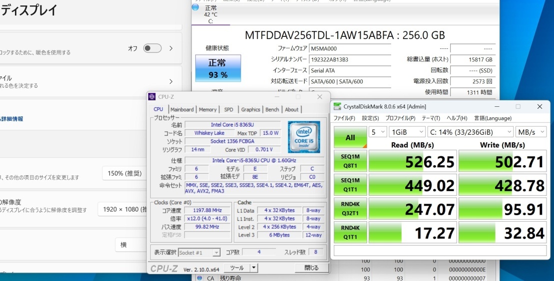 | CPU: 超高速 Intel 高性能 第8世代Core i5-8365u 1.6Ghz、 4コア8スレッド (ターボ・ブースト利用時の最大周波数 4.1GHz) |