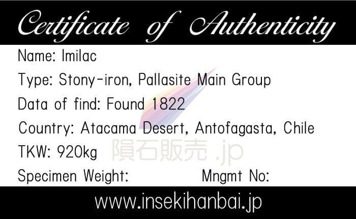 総質量は920kgとされており1822年にチリ北部のアタカマ砂漠で発見されました。kg単位の塊が多くのメテオライトハンターに発見され数g単位の小さな破片も数多く発見されており、イミラック隕石の標本はオリビンのきめが細かく美しいことから隕石コレクターから高く評価されています。近年ではメテオライトハンターが大型の機械を導入し落下地域の捜索を成功させましたが、世界中のコレクターに人気があるため取引価格が上昇しています。