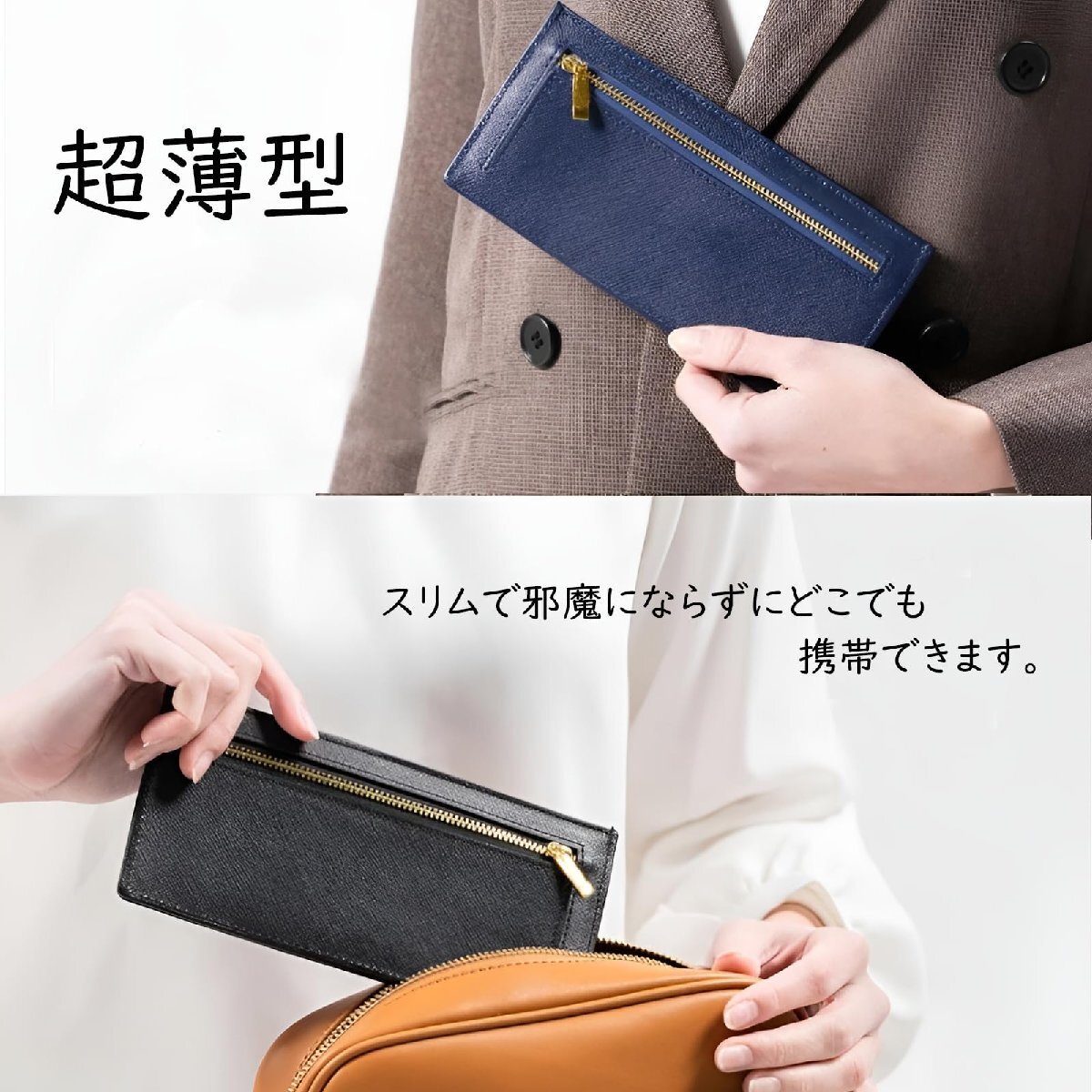 【薄くてもしっかり収納力】6枚のカードポケットと札入れ、ファスナーポケットがついており、薄さの中に必要最低限の収納を実現しています