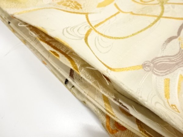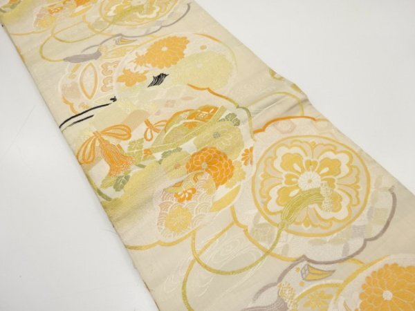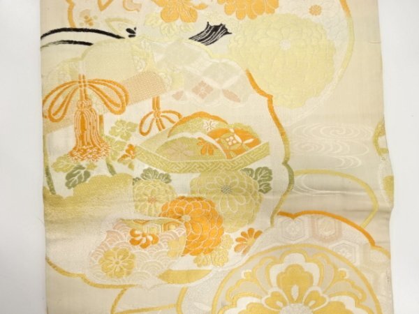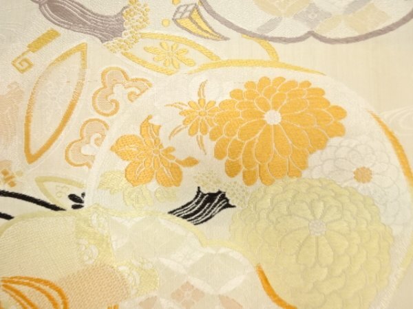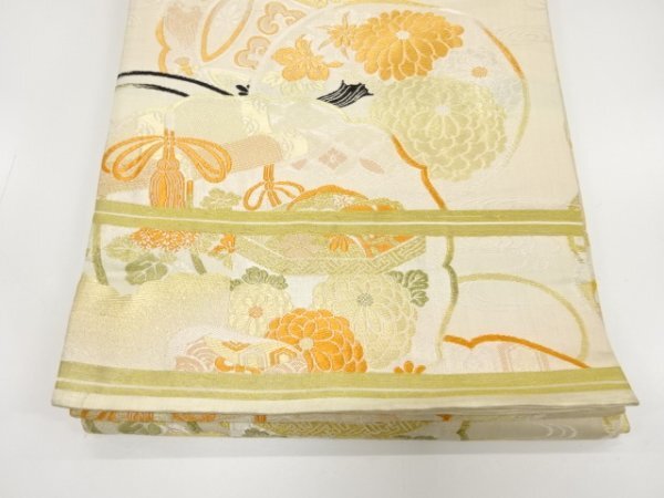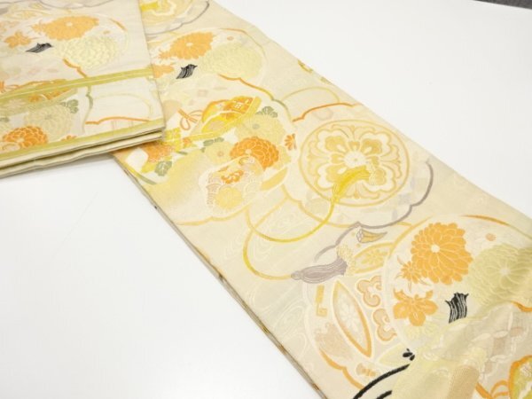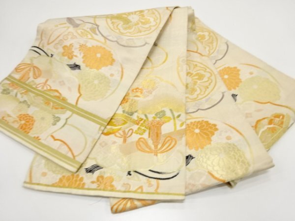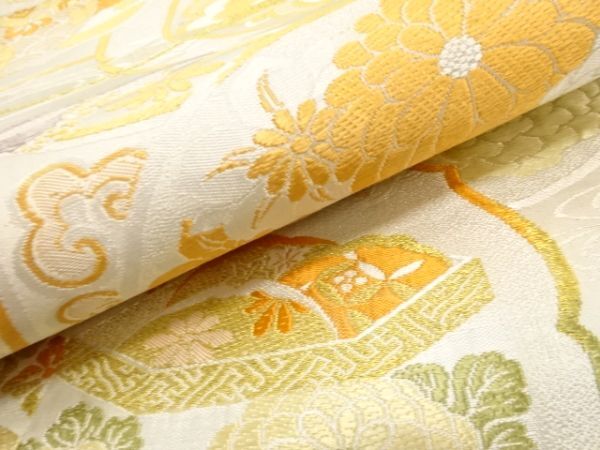 ys7450070; 宗sou 貝桶に几帳・菊模様織り出し丸帯(材料)【アンティーク】【着】