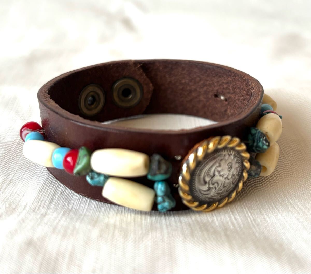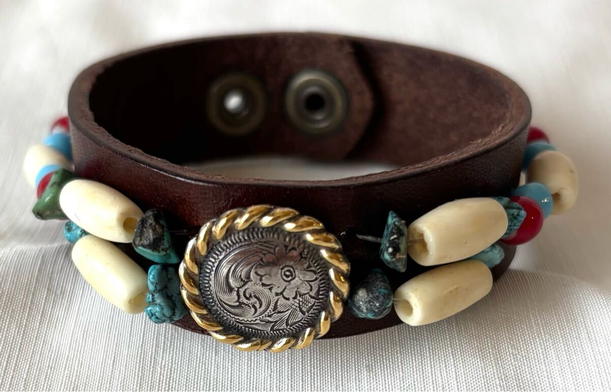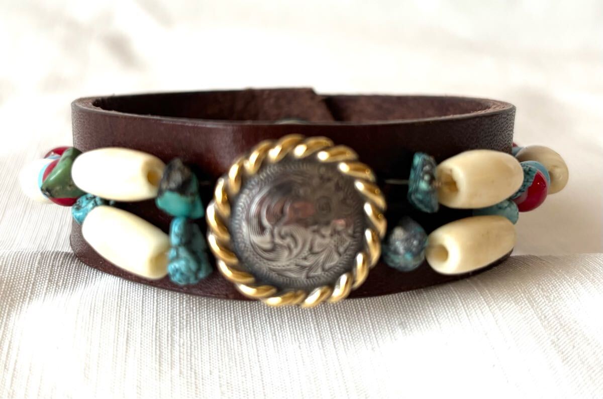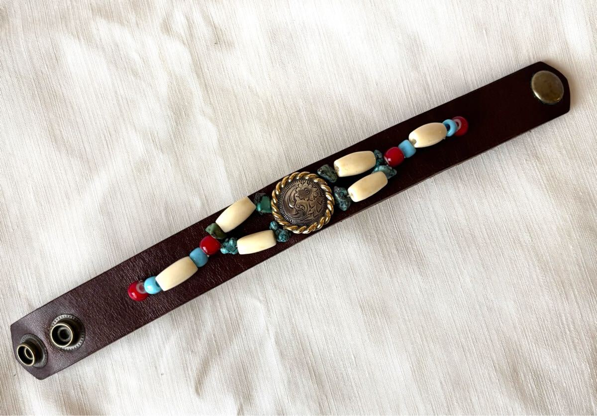 新品未使用のウェスタンコンチョとビーズワークのレザーブレスです。