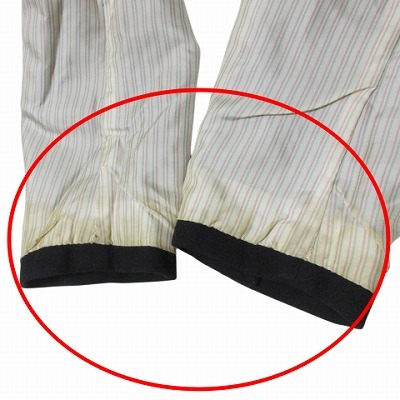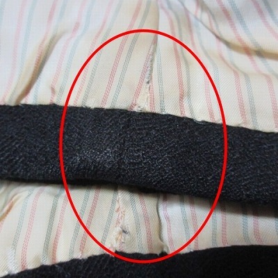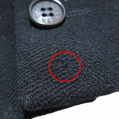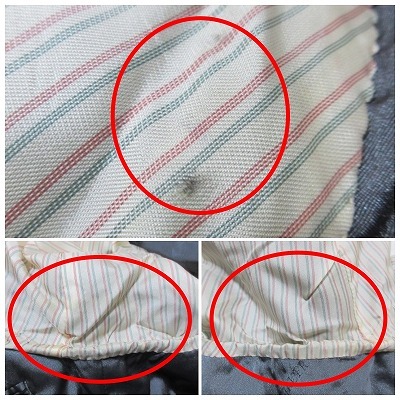 【状態】この商品には下記のようなダメージがあります。 ・裏地の両脇にシミ、左脇に擦り切れ ・両袖口内側に強いシミ、擦り切れ ・右袖口に3mm程度の穴、両袖口に擦れ ※全体的に中古品としての使用感と上記のようなダメージがありますが、通常使用には支障のない商品です。 掲載写真や記載内容をご確認いただき、ご理解の上ご購入ください。